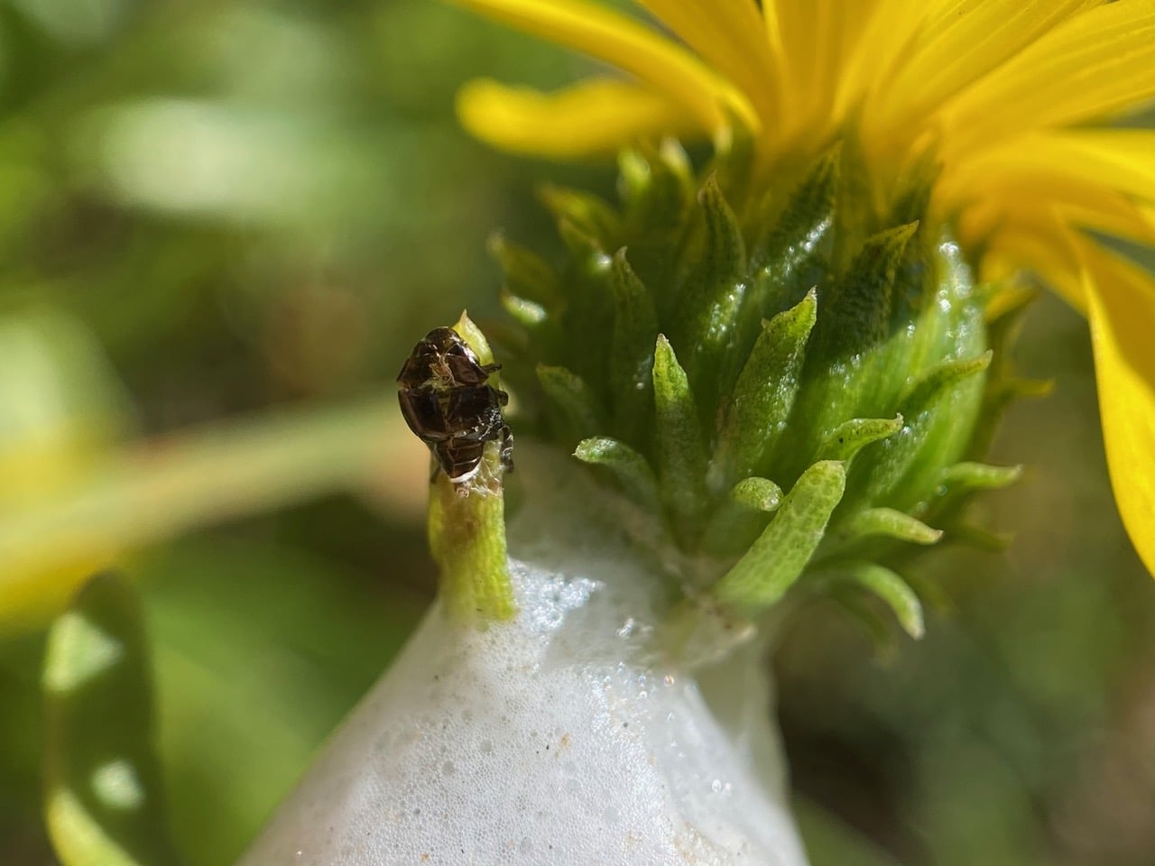 Checking out a Spittlebug foam mass at the base of an immature Grindelia flowerhead, I find a brown exuvia (exoskeleton shed during molting) clinging to the phyllaries above the foam. The mature nymphs apparently leave the foam mass for their final molt into an adult.