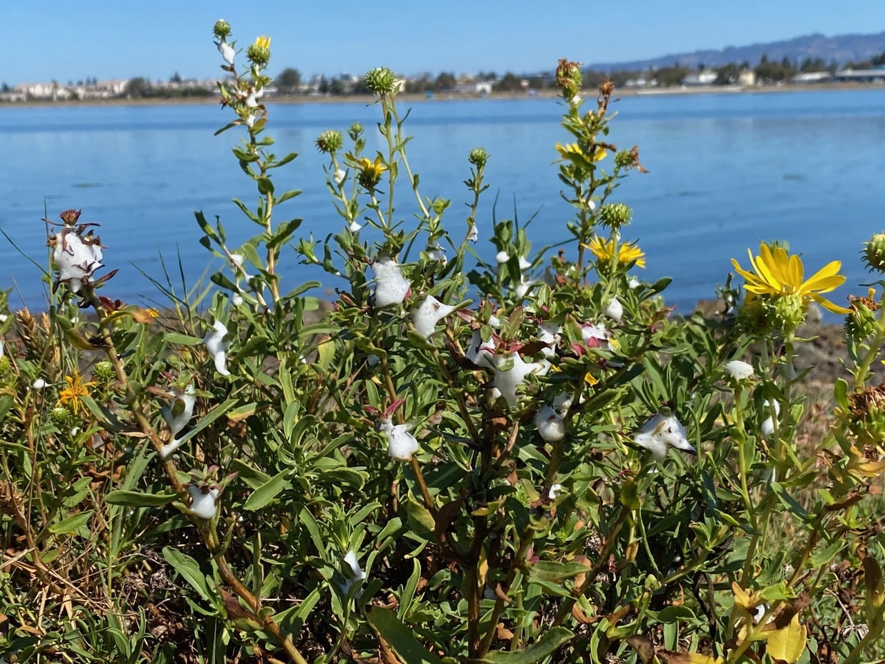 Today I am paying special attention to the Grindelia along this stretch of the shoreline that is heavily infested with Spittle Bugs (superfamily Cercopoidea). Thousands of the larvae have left masses of white foam on the stems of the plants. I have yet to see an adult Spittle Bug.