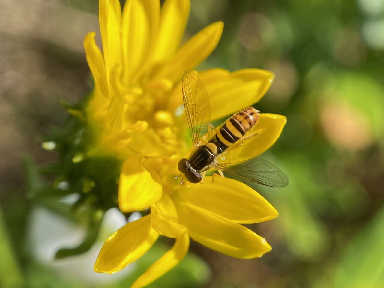 A male Forked Globetail, Sphaerophoria sulphuripes (family Syrphidae) lands to forage on a Grindelia flowerhead.