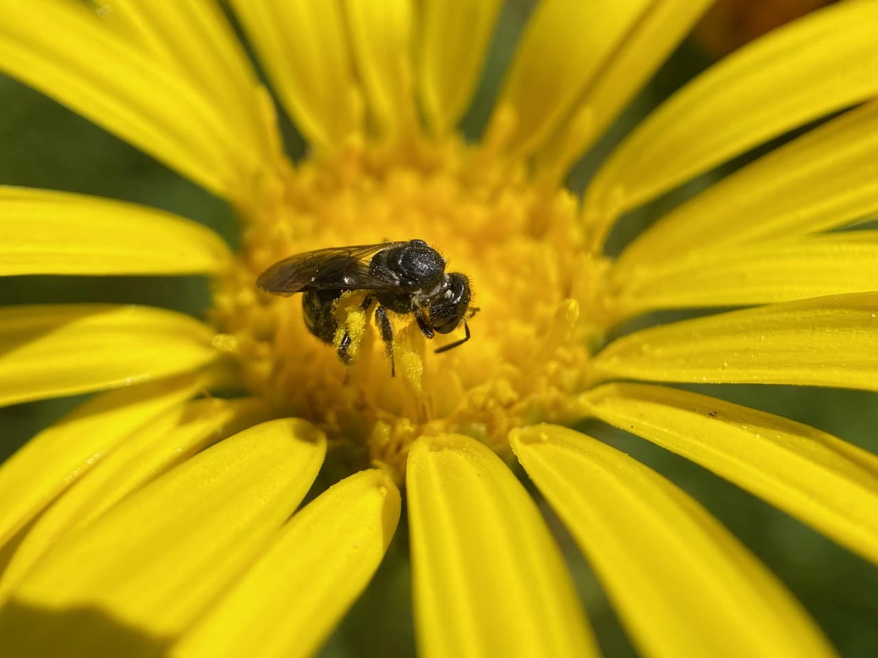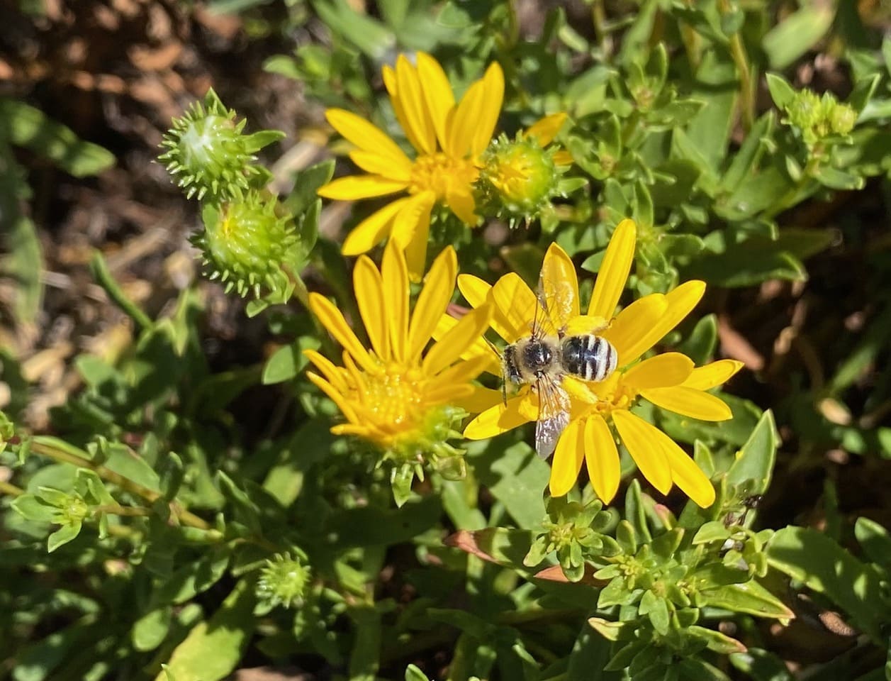 A small black bee with faint white bands across its abdomen is gathering pollen from the Grindelia flowers.
