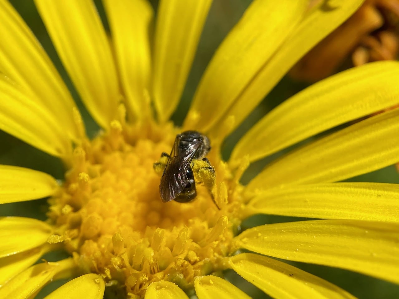 A female Summer Longhorn Bee, Melissodes sp. (family Apidae) is foraging on a Grindelia flowerhead. Note the huge load of pollen in her scopae.