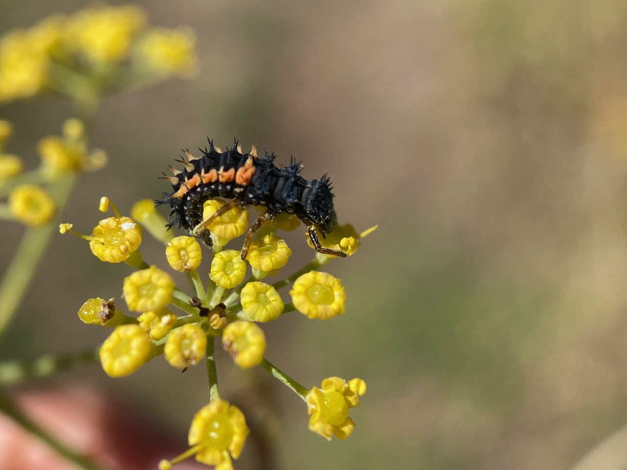 Passing a Fennel along the dirt path, I spot a Lady Beetle larva (family Coccinellidae) on the flowers. Is it hunting aphids? The plant does not seem to be infested with aphids.