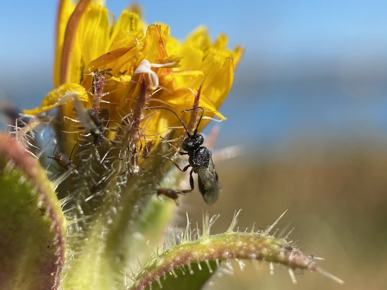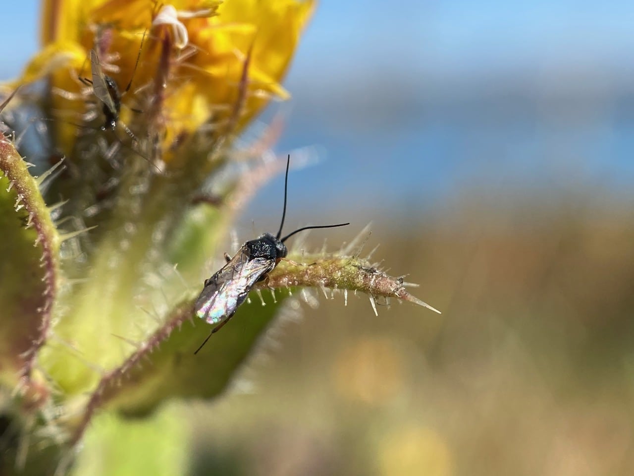A small wasp with long antennae lands on a spiny phyllary of Bristly Oxtongue.