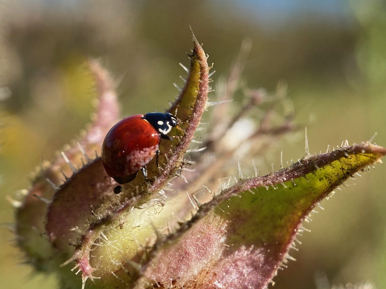Here’s a different species of Lady Beetle on the spiny phyllary of a Bristly Oxtongue flowerhead. It is the Spotless Lady Beetle, Cycloneda sanguinea (family Coccinellidae).
