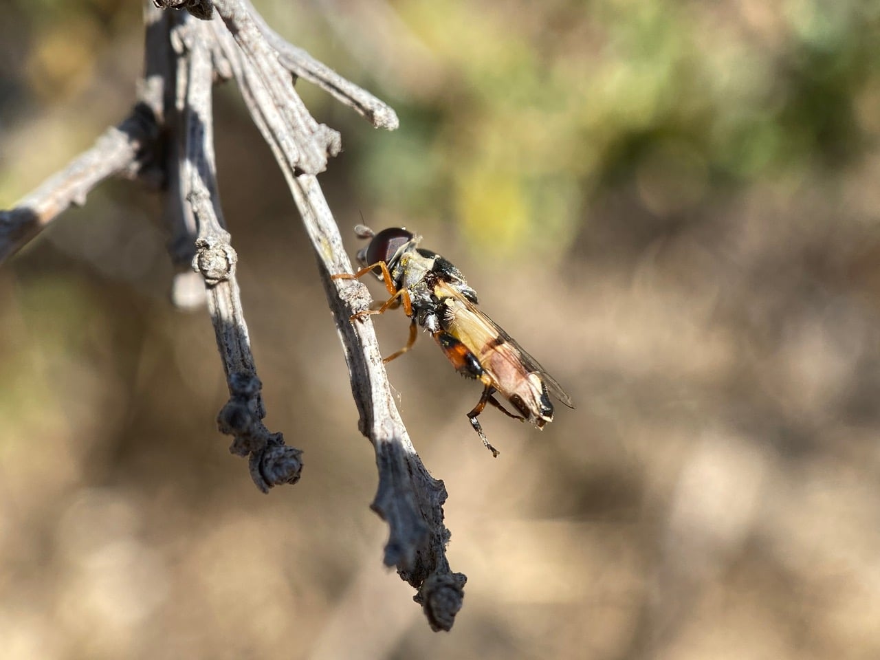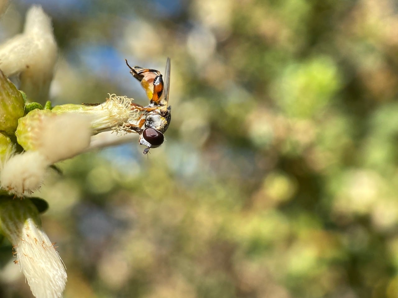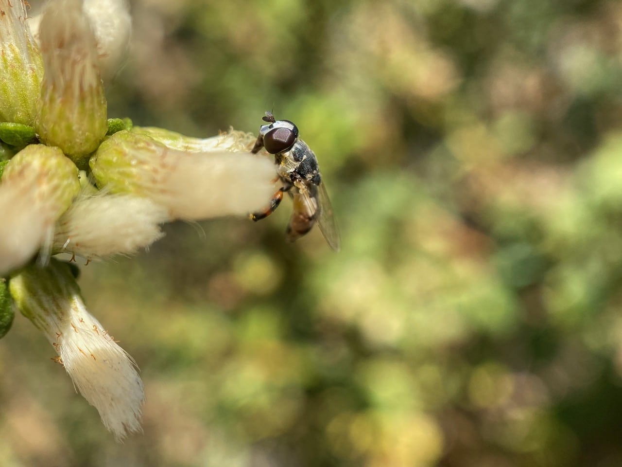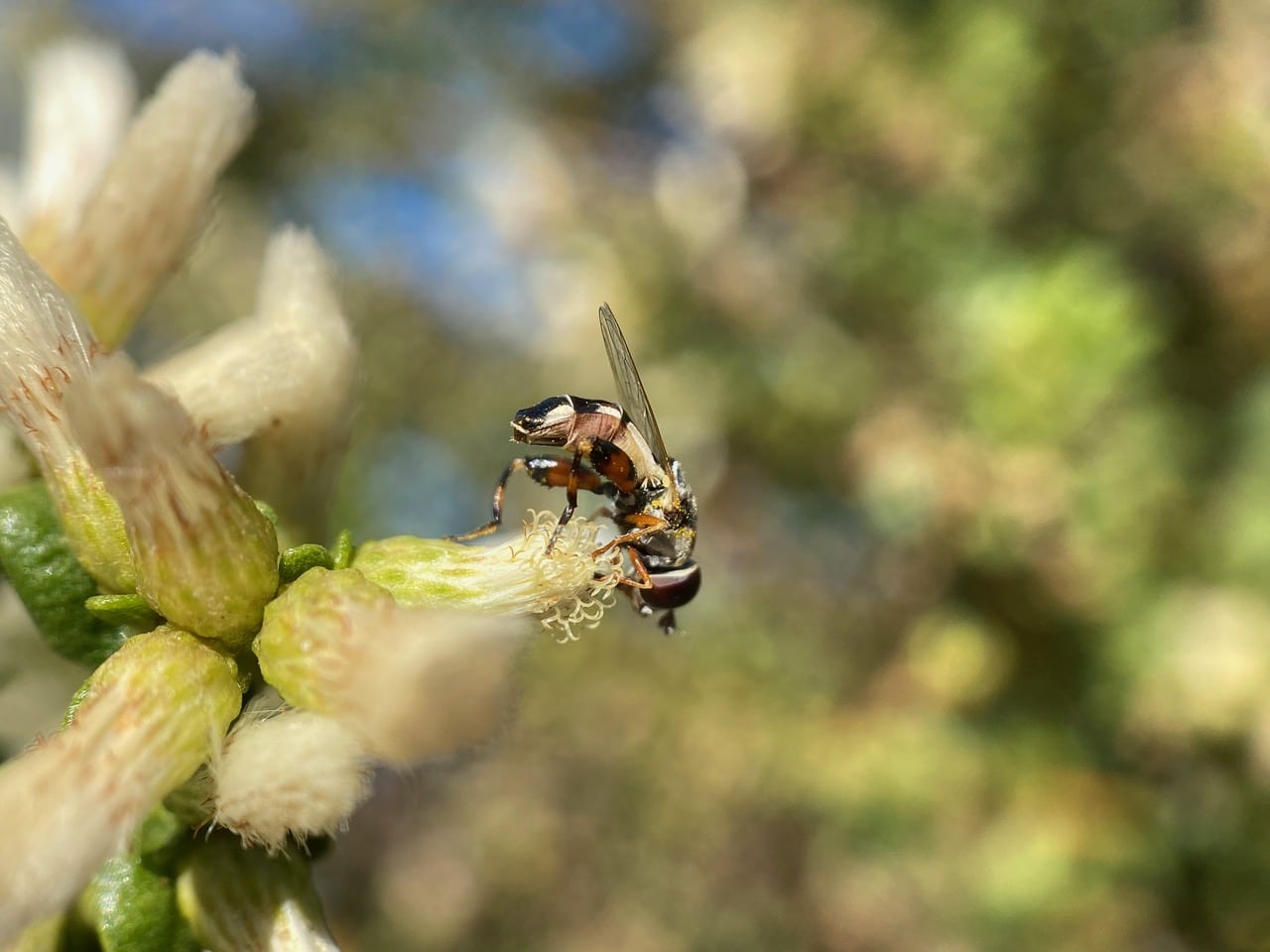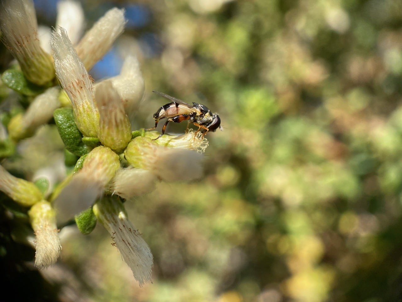 A hoverfly is perched on a flowerhead of female Coyote Brush, sipping nectar. It looks familiar – a Thick-legged Fly?