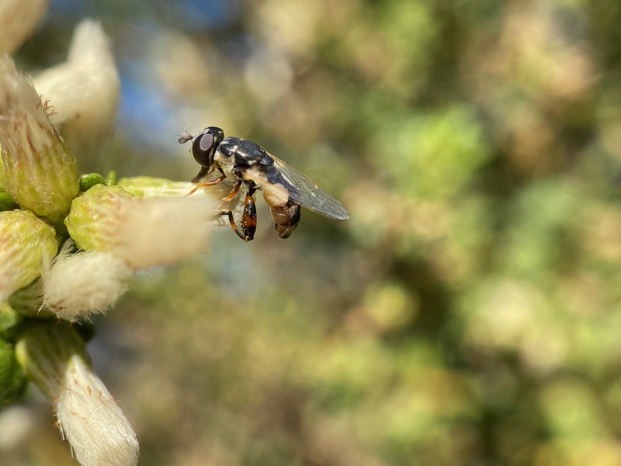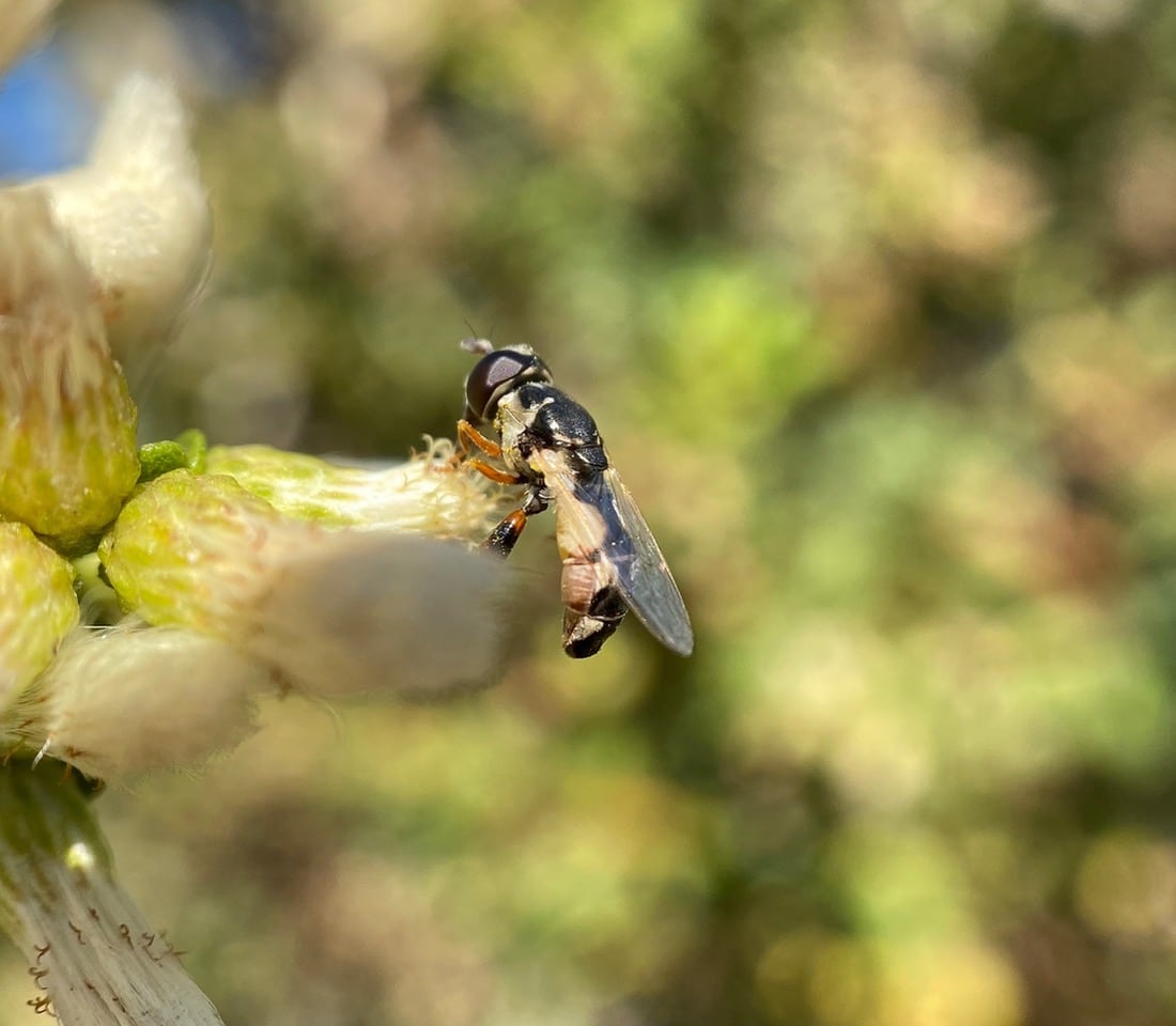 The Peg-legged Compost Fly, Syritta flaviventris (family Syrphidae) is a hover fly native to Europe and Africa. It was introduced to the United States in the 1990’s. The species is very similar to the Thick-legged Hover Fly, Syritta pipiens, also native to Europe. Both species have an enlarged hind femur, which distinguishes the genus Syritta. Adults are low-flying and are rarely seen flying higher than a meter from the ground. The larvae and puparia are found in damp decaying plant matter, also in animal and human manure. Their preferred habitat is a moist to damp environment, with good vegetation growth. Adults visit a wide variety of flowers for pollen and nectar.