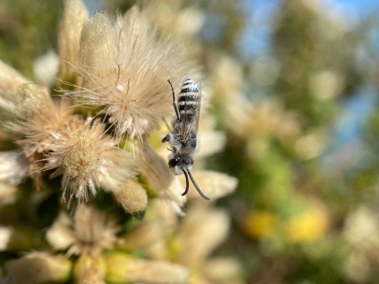 The male Colletes (family Colletidae) is hanging upside down grooming himself. It is a fuzzy bee with white hairs all over, especially on his face. As in most bees, males are identified by their longer antennae.