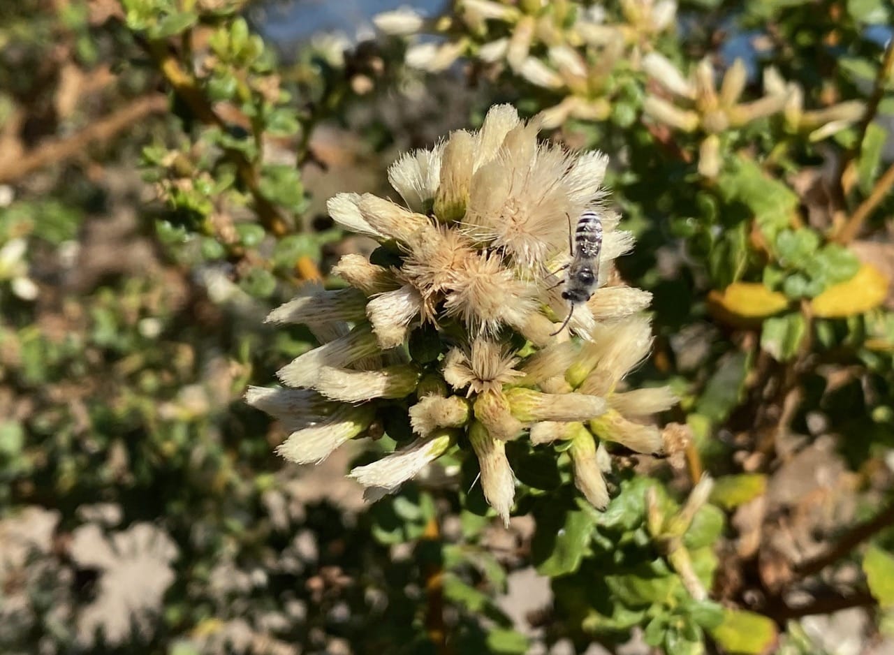 A small swarm of insects are dancing over the female Coyote Brush, Baccharis pilularis by the trail. In flight, they look almost bluish. But when one finally lands on an inflorescence, I recognize it as a male Cellophane Bee, Colletes sp. (family Colletidae) with black-and-white banded abdomen.