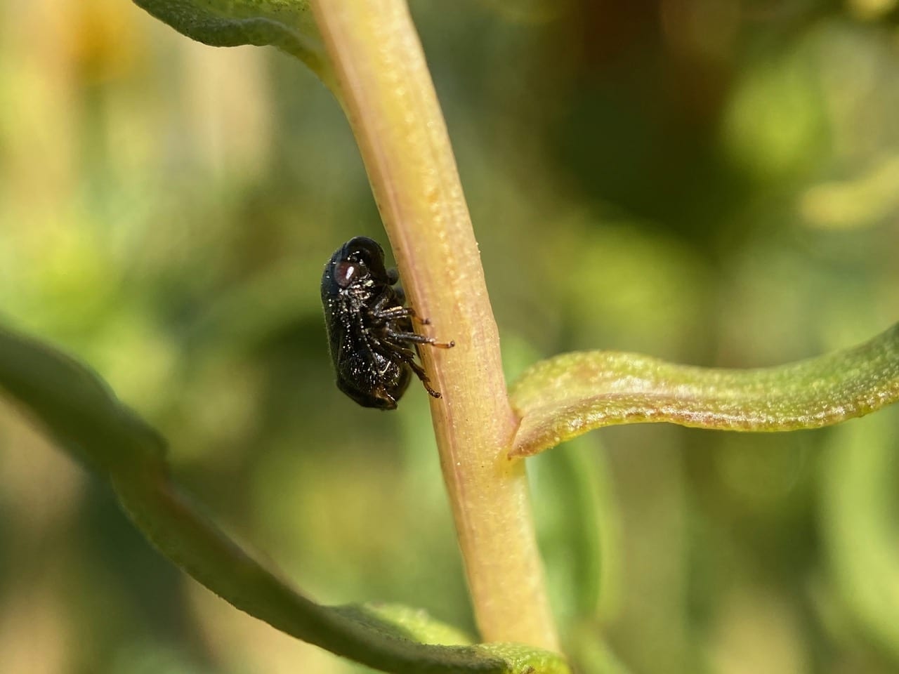 An adult Spittlebug (or Froghopper), Clastoptera lineatocollis (family Clastopteridae) is perched on the stem of Grindelia.