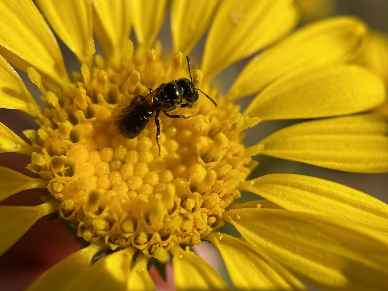 A Small Carpenter Bee, Ceratina sp. (family Apidae) is foraging on a Grindelia flowerhead.