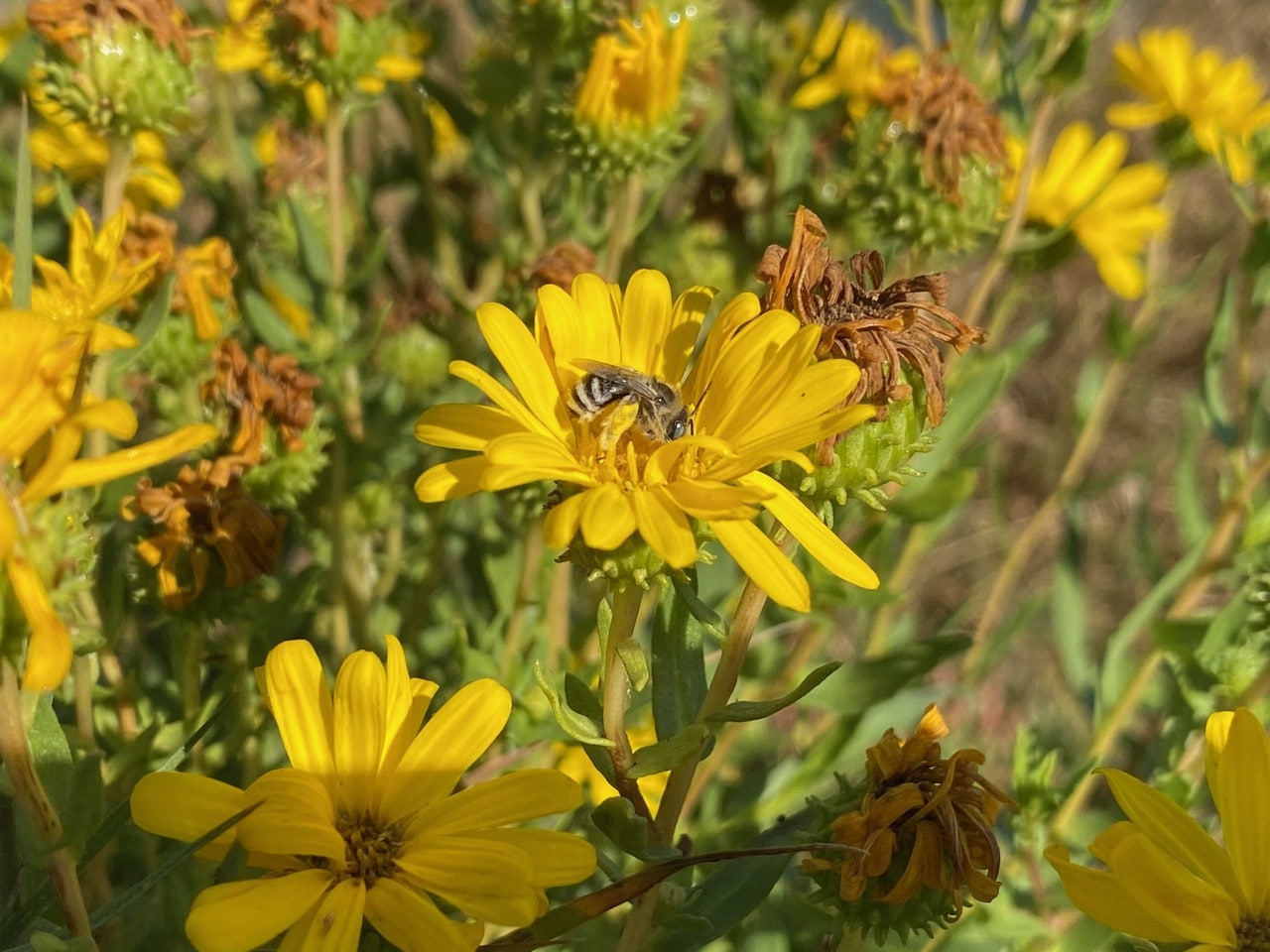 A female Summer Longhorn Bee, Melissodes sp. (family Apidae) is out foraging in a dense patch of Oregon Gumweed, Grindelia stricta by the water.