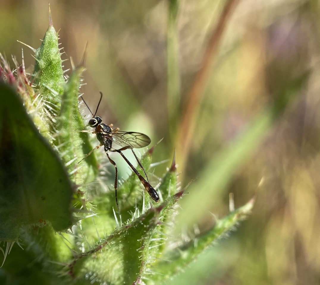A few tiny, skinny wasps, no more than 1/4 inch long are hovering over the greener parts of the Bristly Oxtongue. Here one wasp has landed to investigate the phyllaries of an immature flowerhead. It is an Ichneumon Wasp, Anomalon sp. (family Ichneumonidae), easily recognizable from the long antennae, elongate and slender abdomen, and the well-defined pale ring around the eyes.