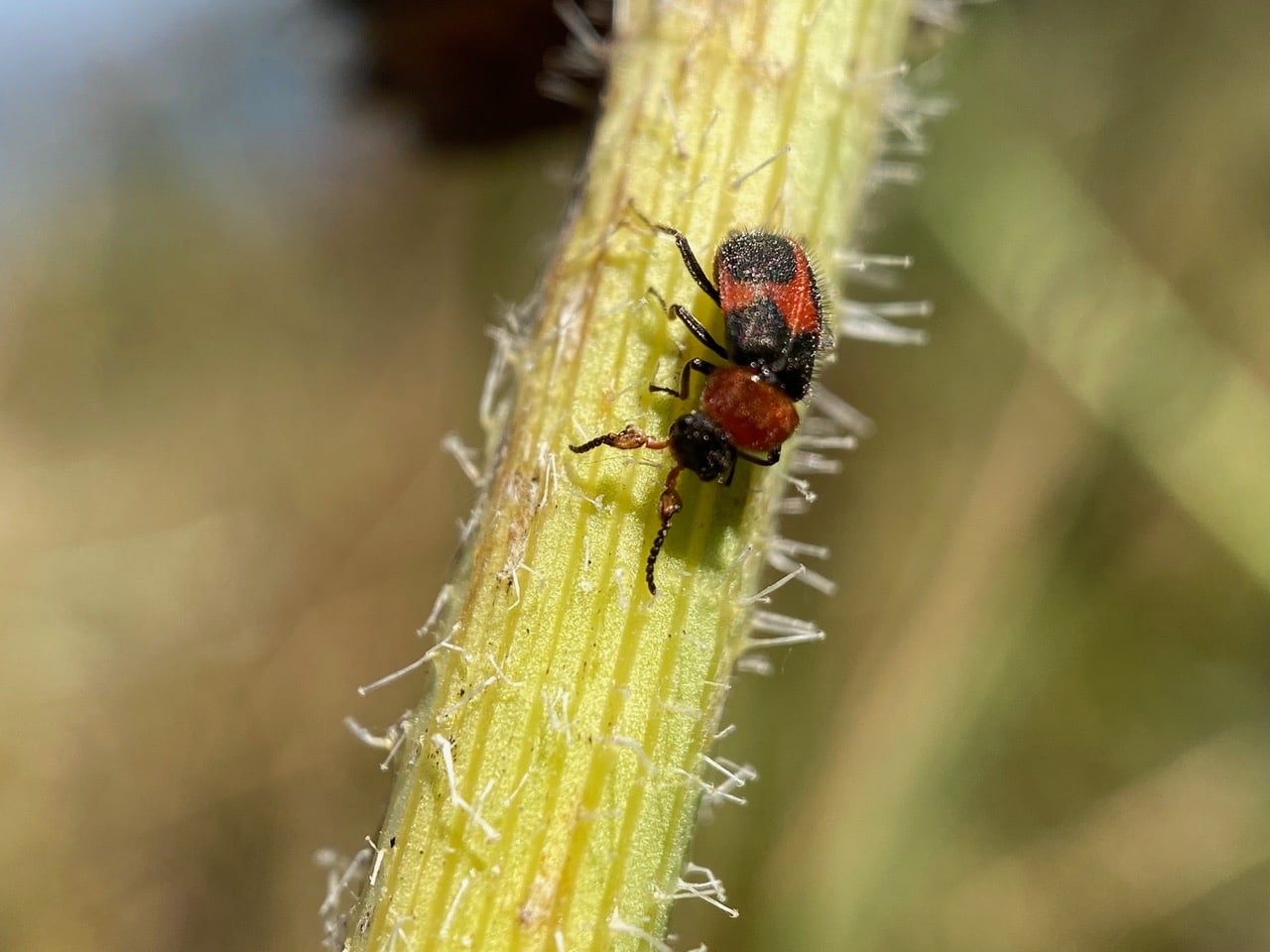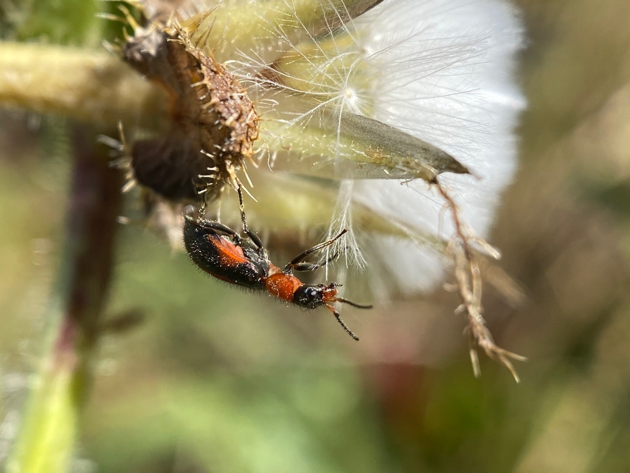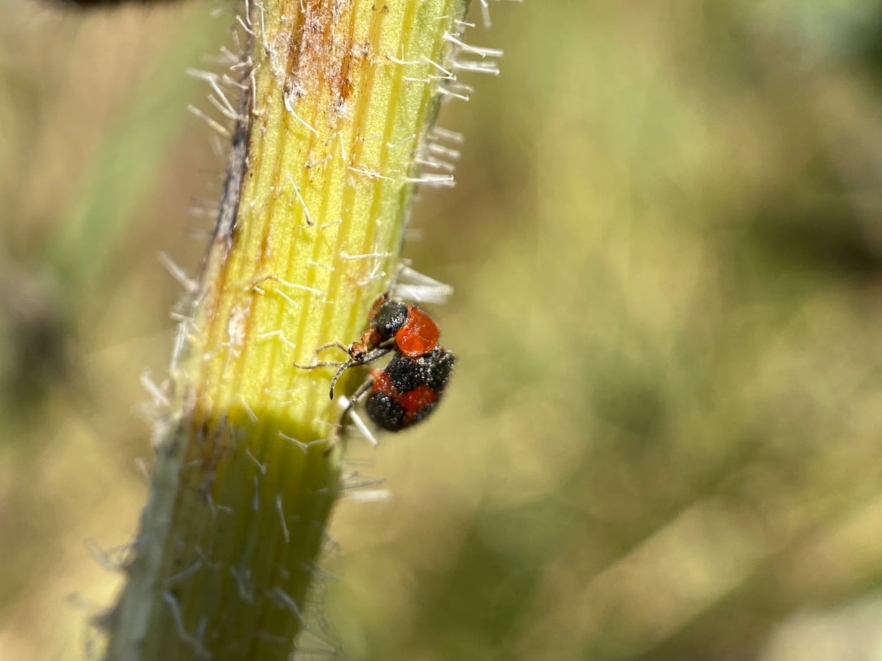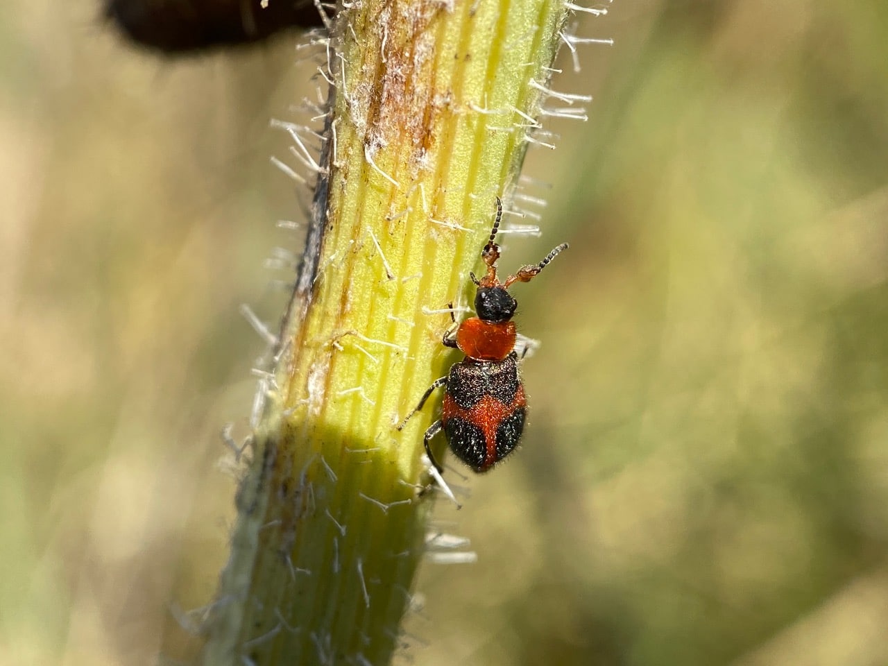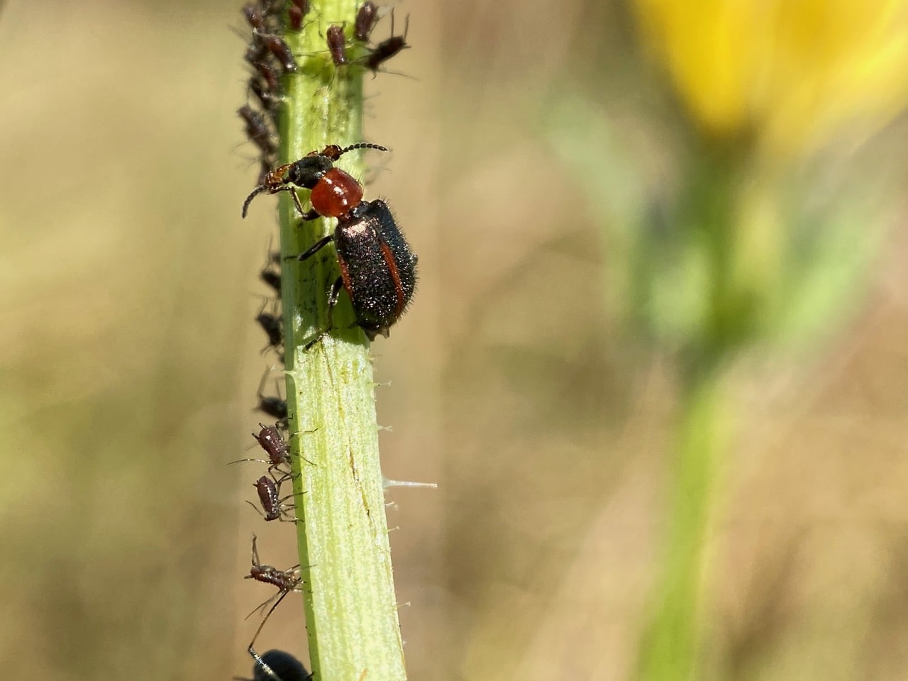 I am thrilled to find a Collops beetle on the stem of a Bristly Oxtongue that is infested with aphids. To my surprise, instead of feeding on the aphids, the male is actually fussing with his antennae.