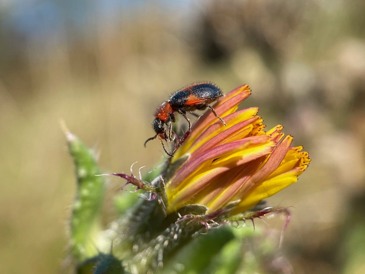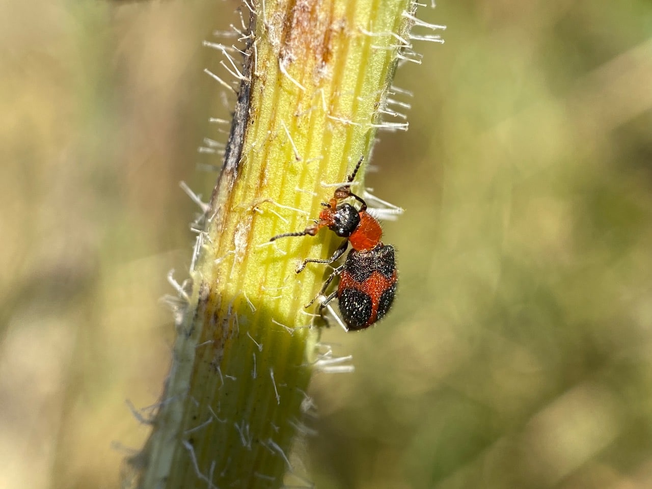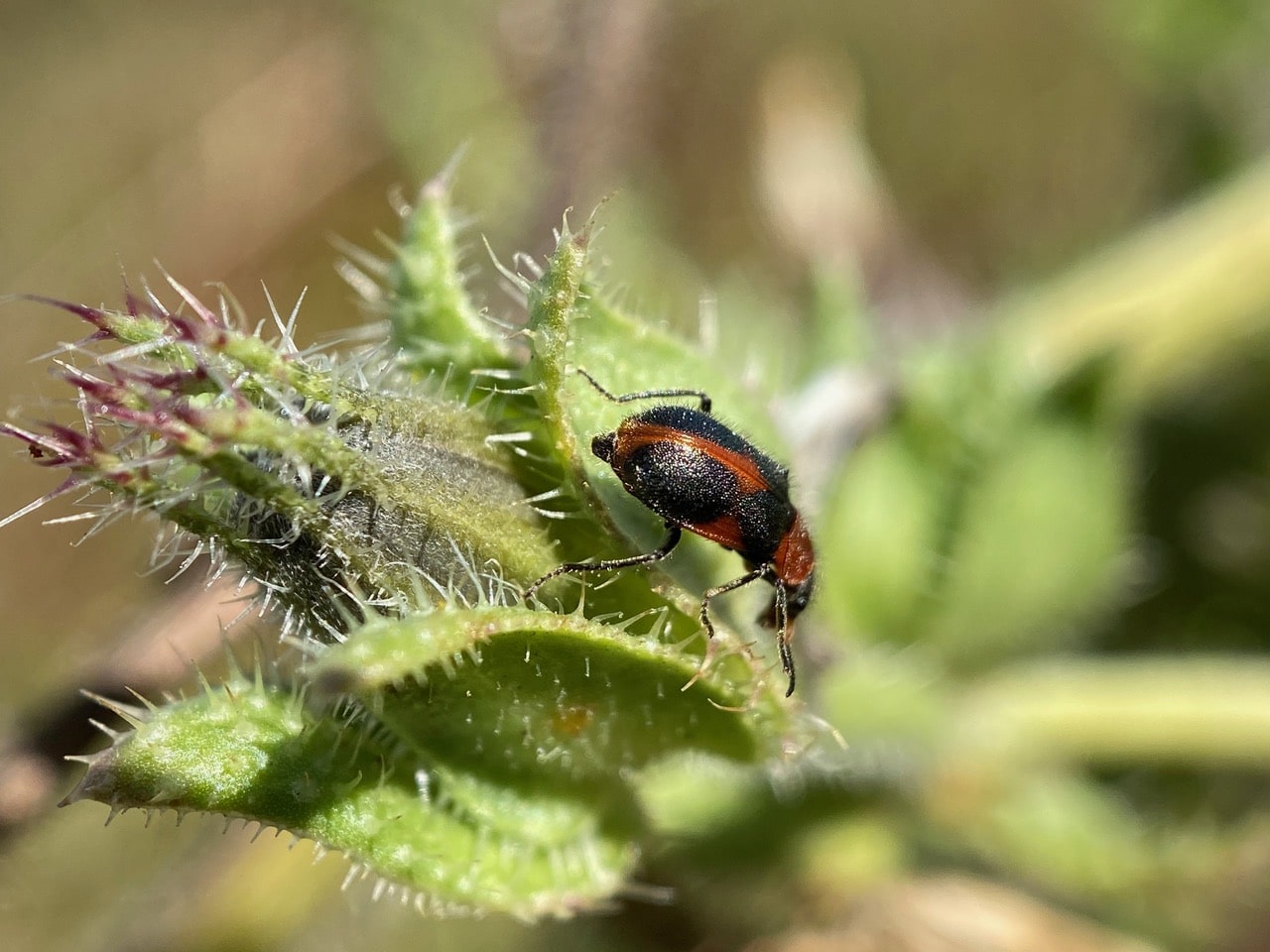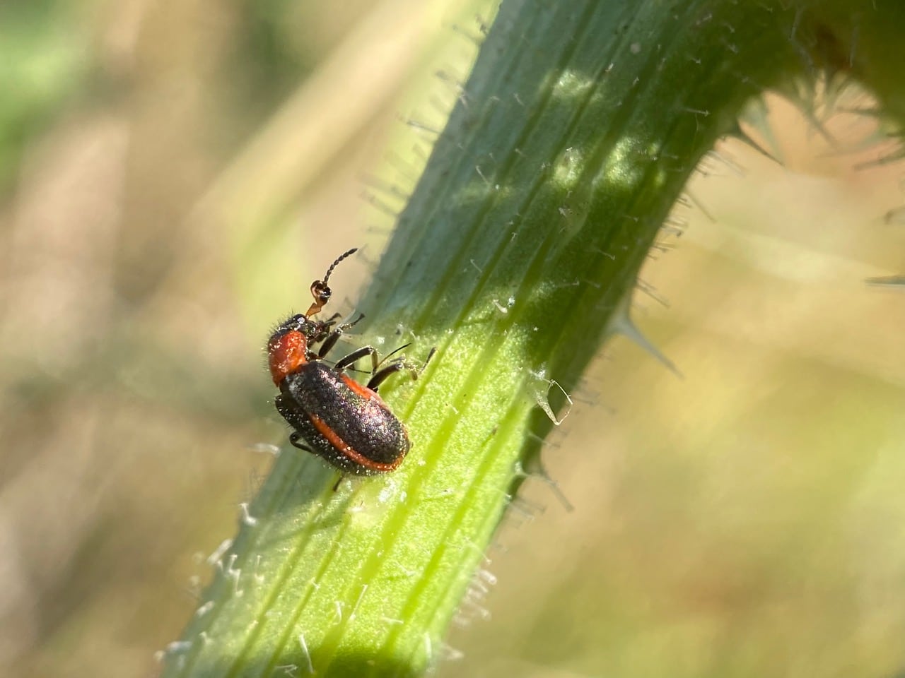 I am thrilled to find a Collops beetle on the stem of a Bristly Oxtongue that is infested with aphids. To my surprise, instead of feeding on the aphids, the male is actually fussing with his antennae.