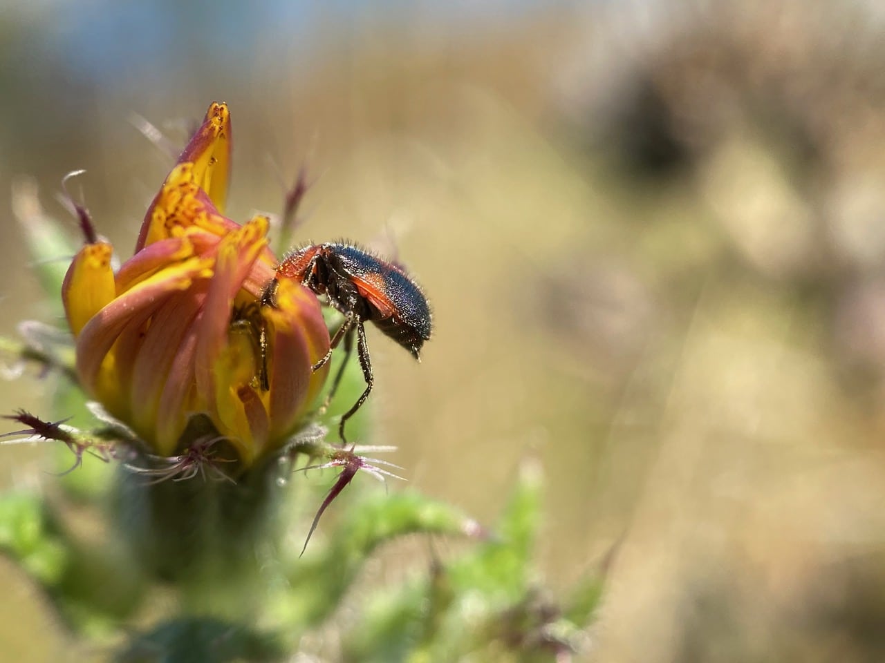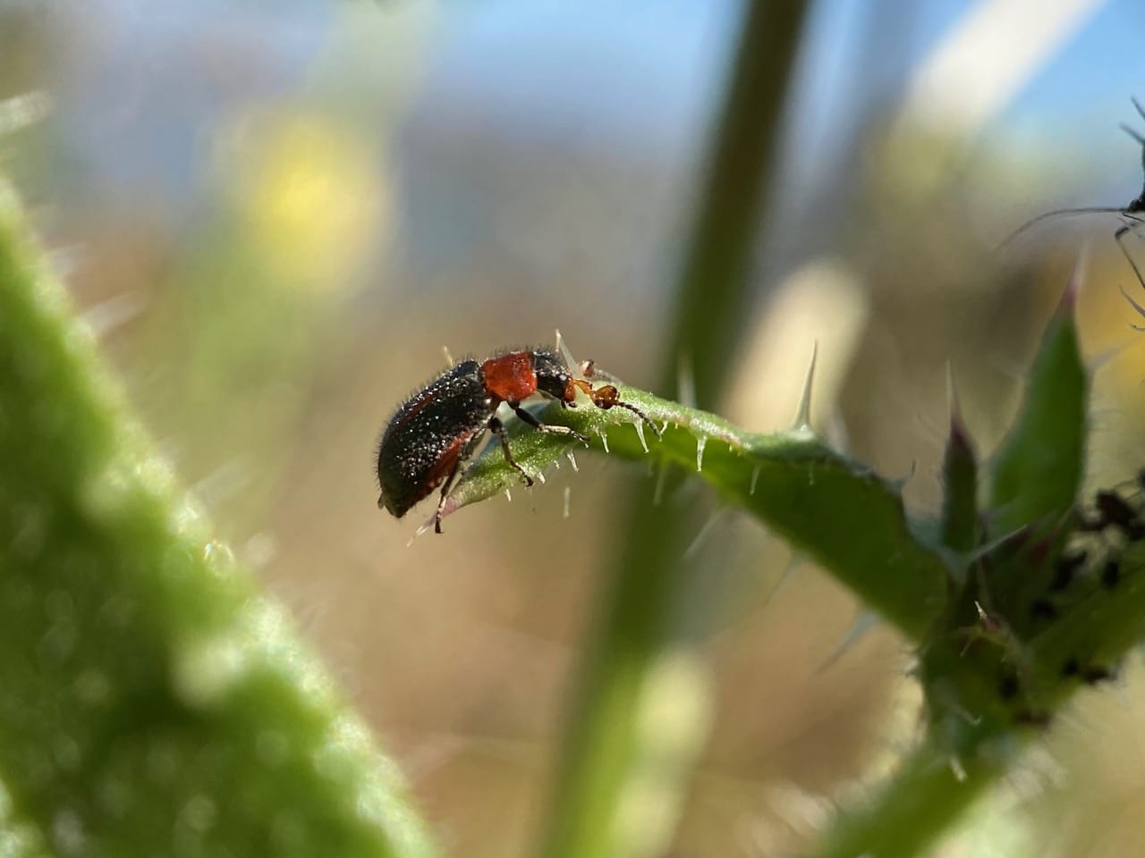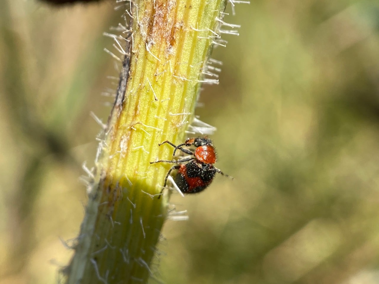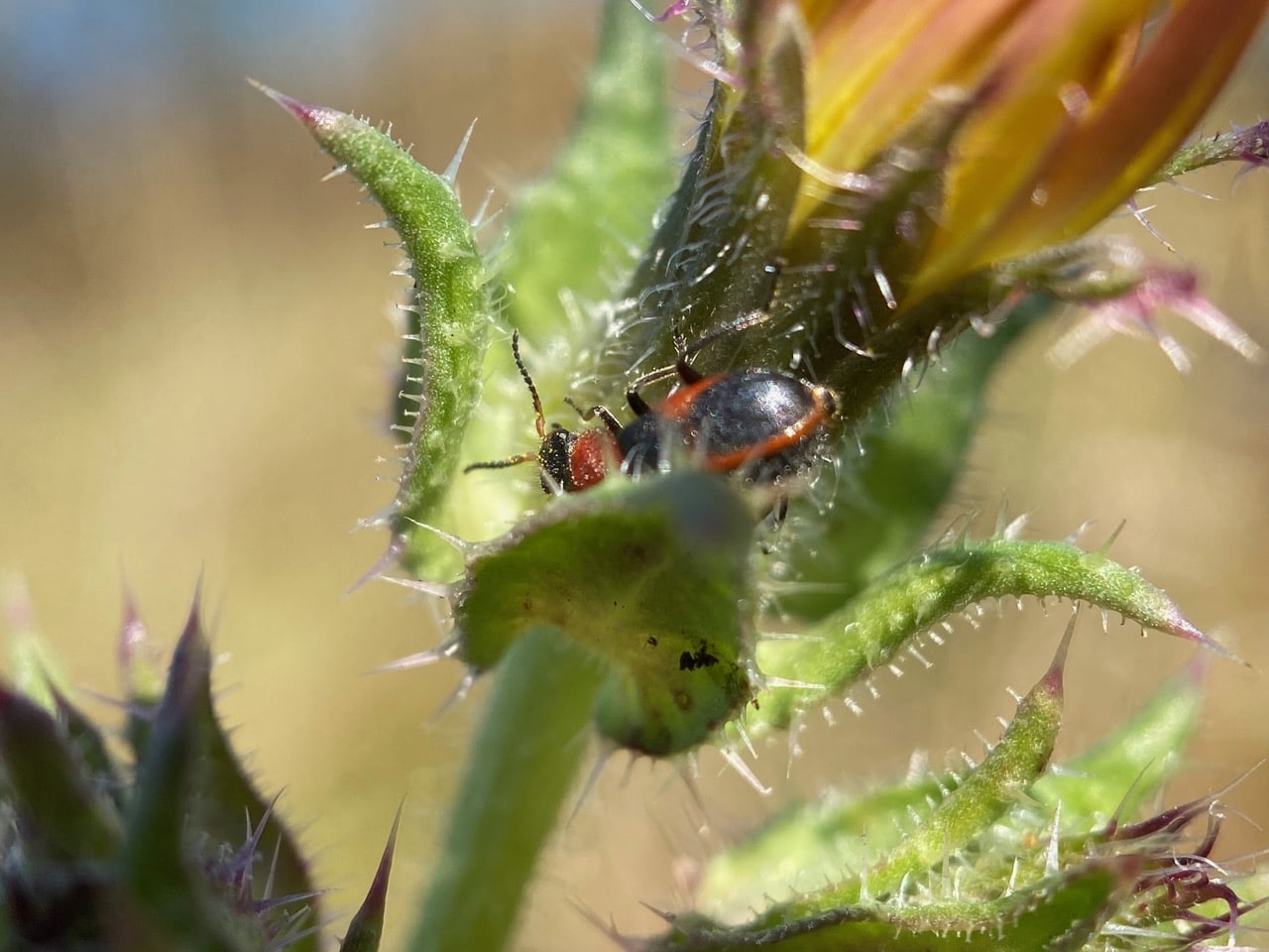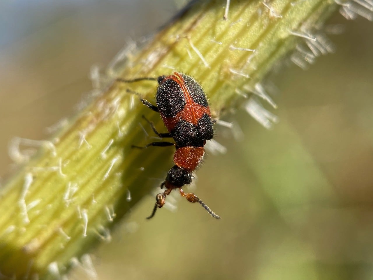 I am thrilled to find a Collops beetle on the stem of a Bristly Oxtongue that is infested with aphids. To my surprise, instead of feeding on the aphids, the male is actually fussing with his antennae.