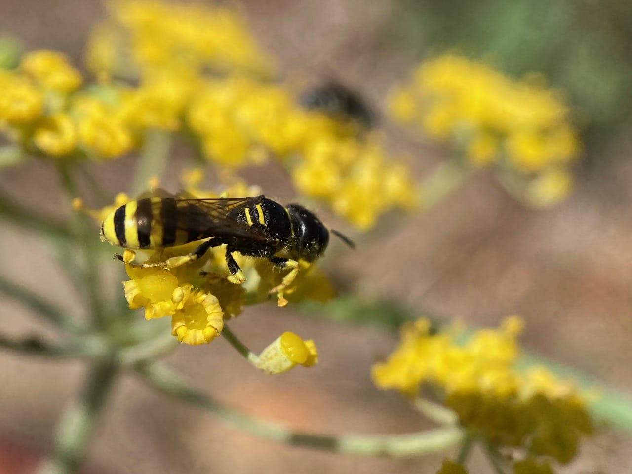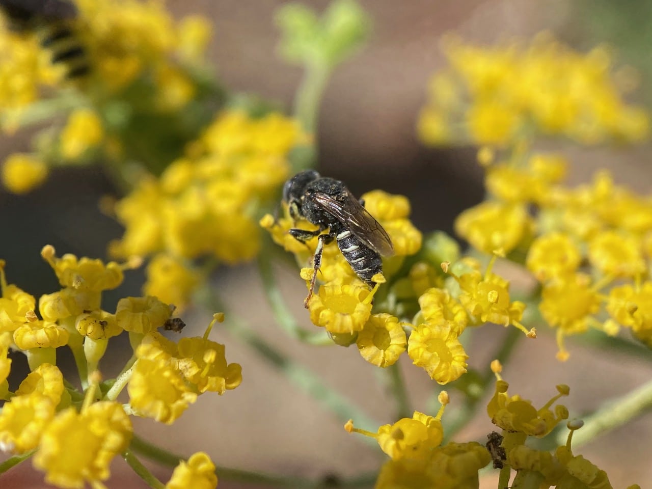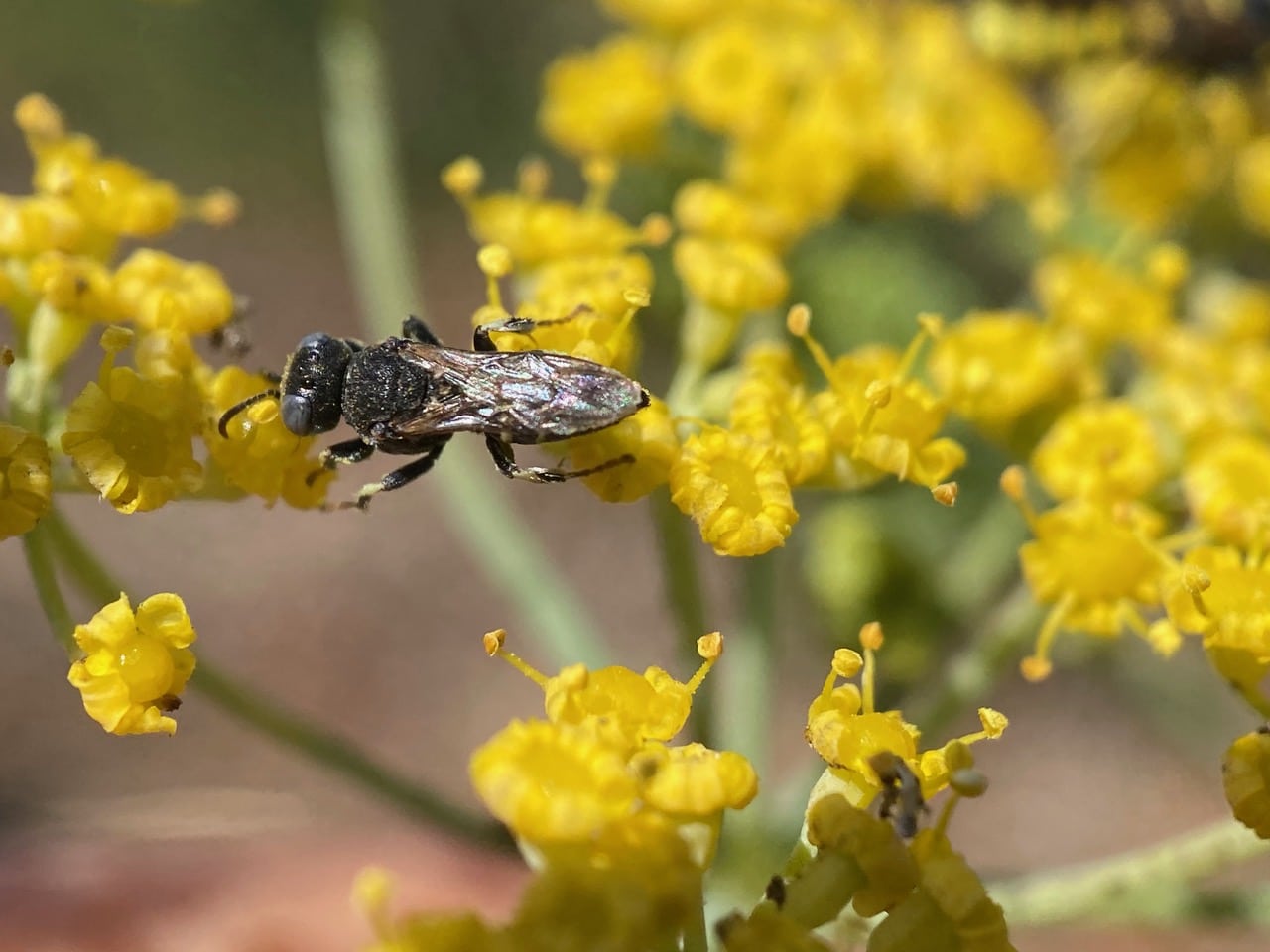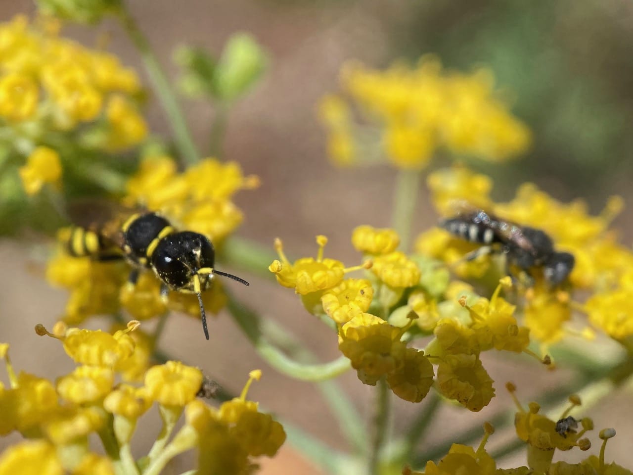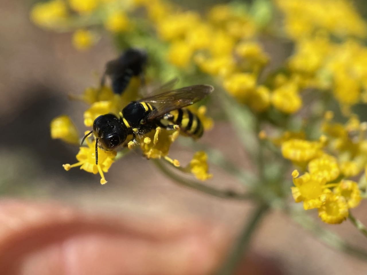 A tall Fennel is waving wildly in the wind, with two small insects desperately foraging on an umbel of fresh flowers. Grabbing the branch to steady it, I make out two wasp-like insects that I don’t recognize.