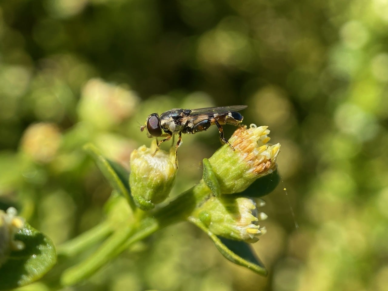 A female Forked Globetail, Sphaerophoria sulphuripes (family Syrphidae) lands on an immature flowerhead of a male Coyote Brush and proceeds to groom herself.