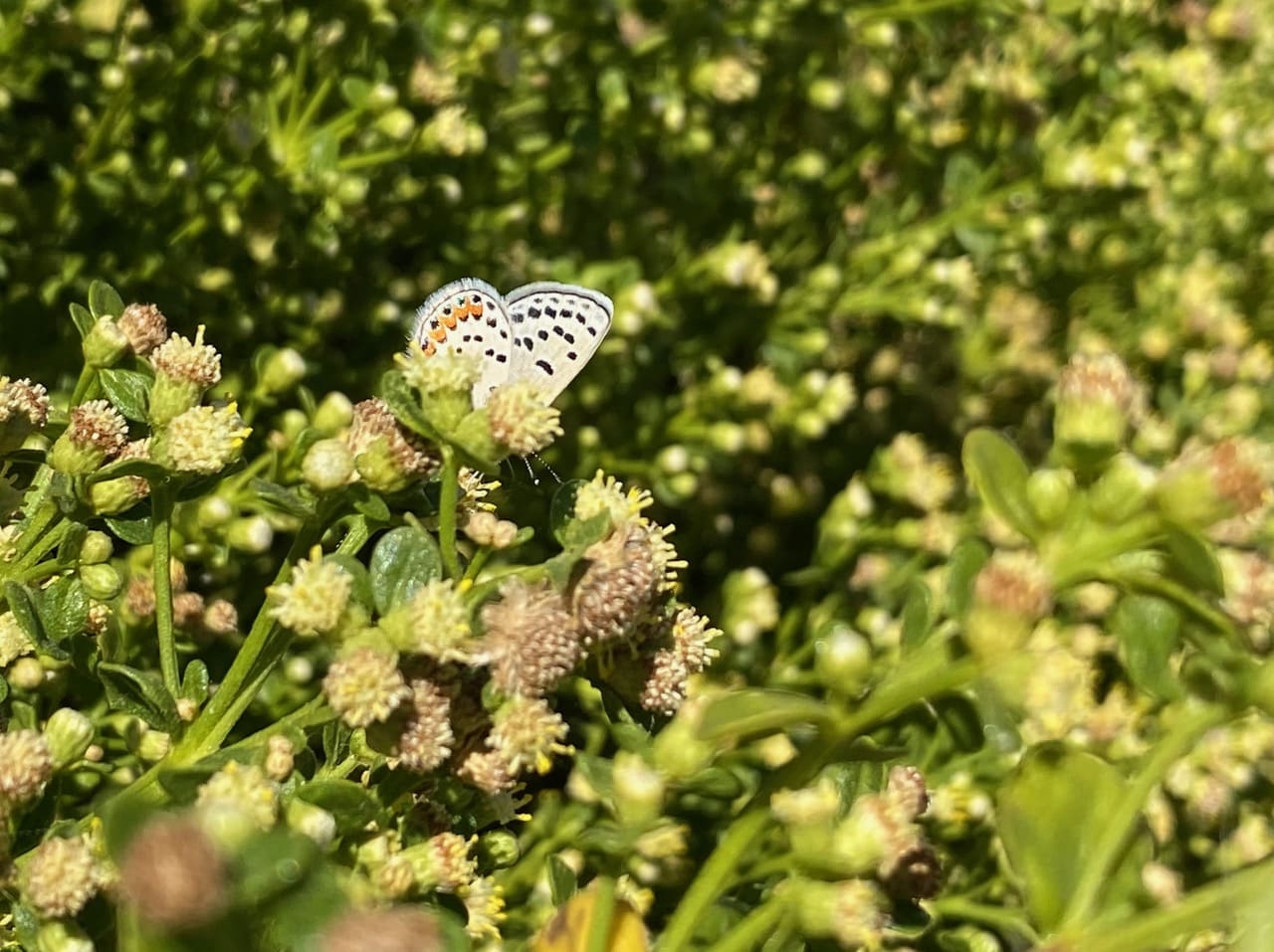 Partially hidden, an Acmon Blue butterfly, Icaricia acmon (family Lycaenidae) is taking nectar from a cluster of flowerheads of a male Coyote Brush. Acmon Blue is easily distinguished from the other “blues” by the band of red-orange markings along the trailing edge of the hind wings.