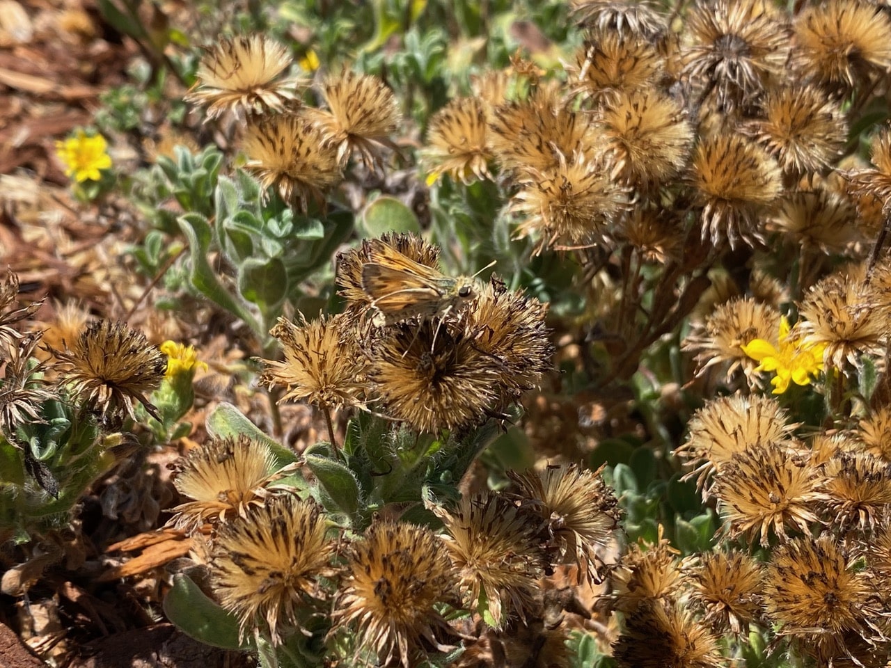 A Skipper butterfly lands on a seed head of San Bruno Mountain Aster, Heterotheca sessiliflora, and instantly disappears from view. The camouflage is uncanny. Are insects aware of their own appearance, and do they perch preferentially on surfaces with which they blend well?