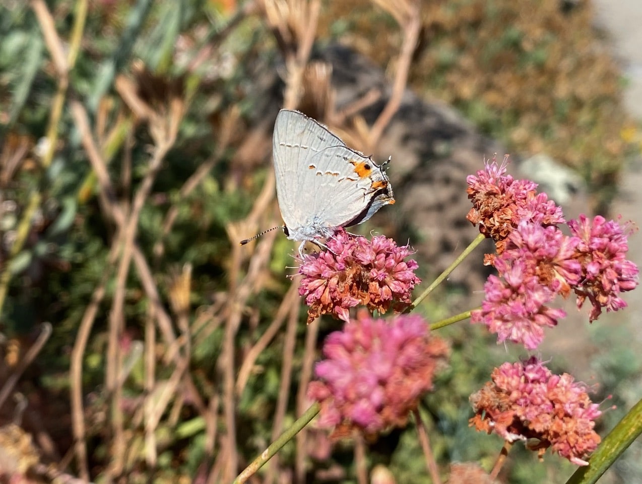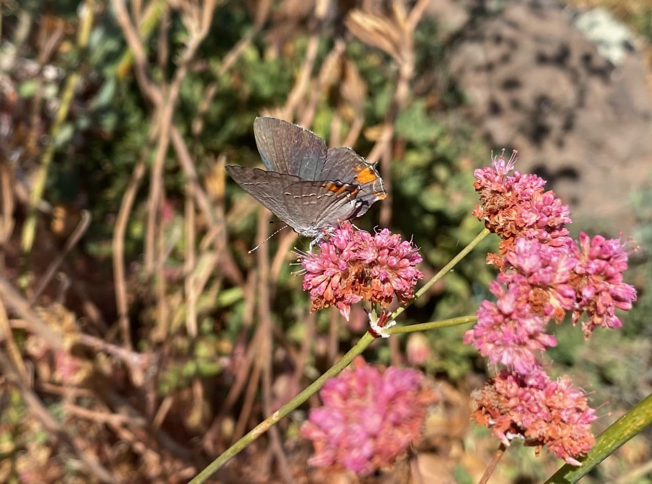 A Gray Hairstreak, Strymon melinus (family Lycaenidae) is perched on a fading inflorescence of Red-flowered Buckwheat, rubbing its hind wings together continuously.