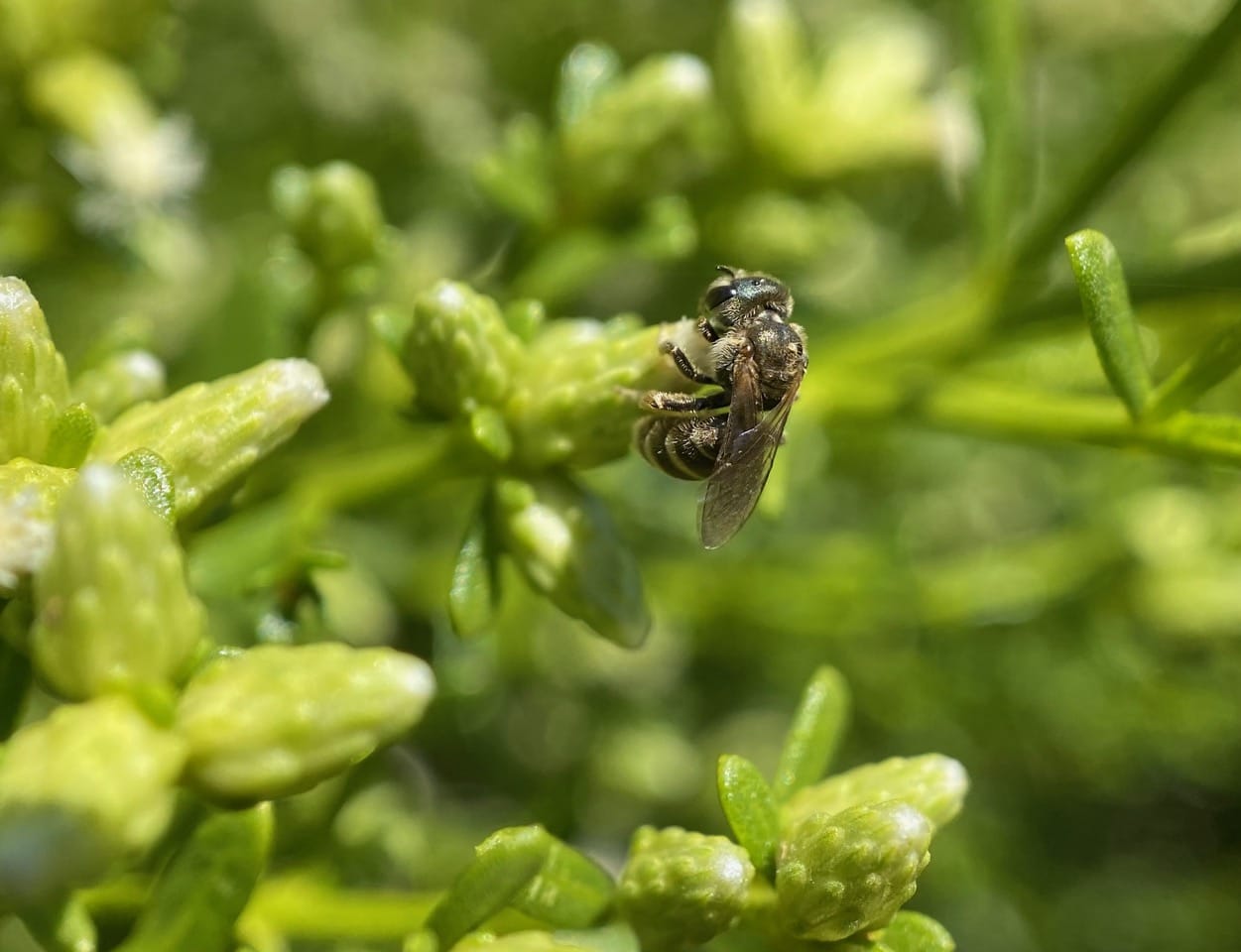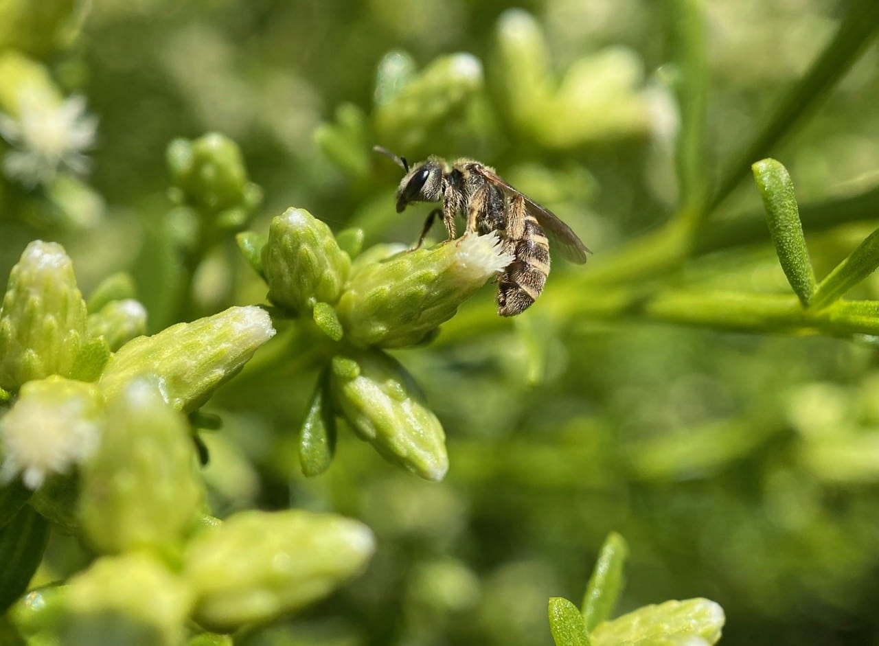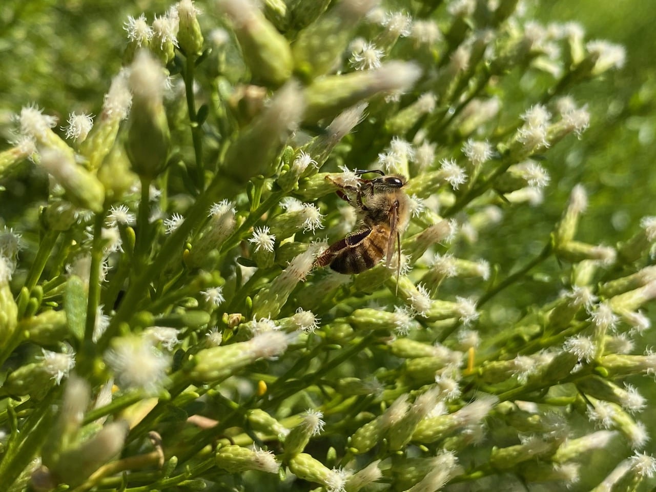 The female Coyote Brush, Baccharis pilularis in the backyard is in peak bloom, attracting a hoard of Honey Bees, Apis mellifera (family Apidae) seeking nectar.