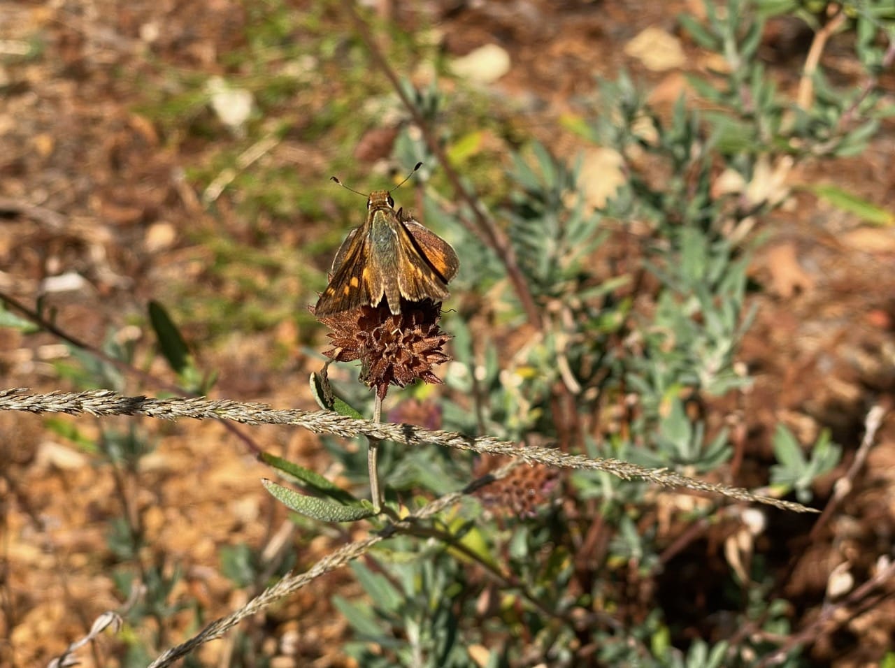 An Umber Skipper performs a disappearing act as it lands on a brown seed head of a Sage, Salvia sp.