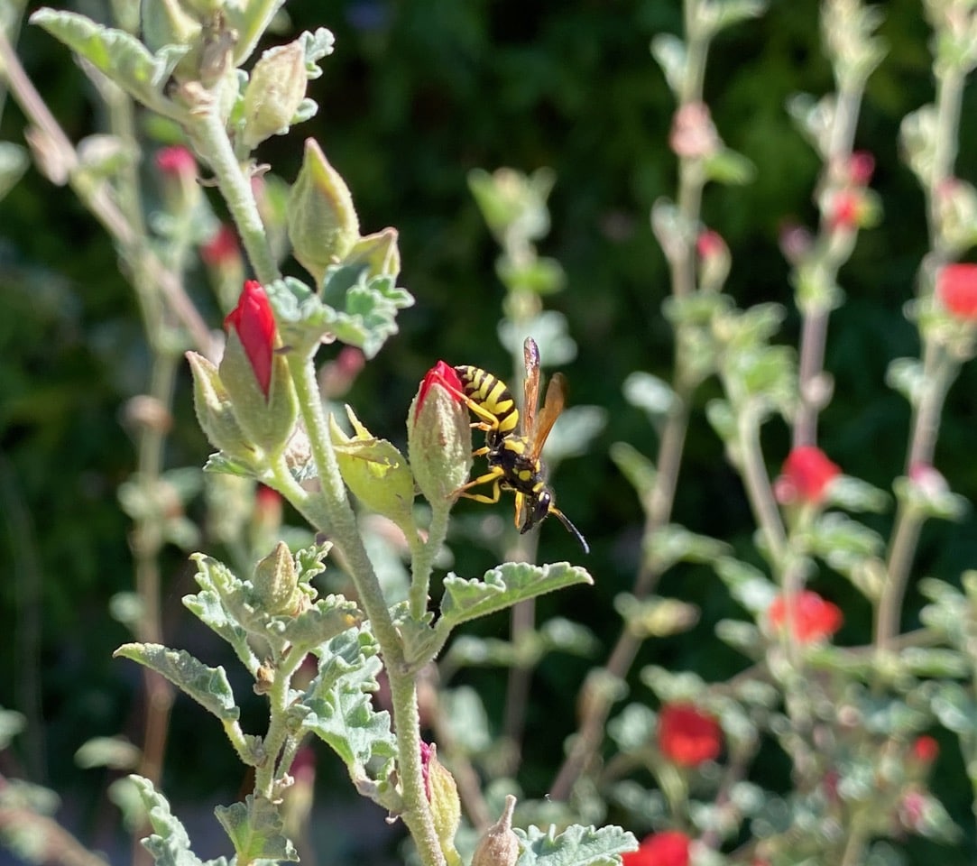 A Mason Wasp (family Vespidae, subfamily Eumeninae) is hunting on a still blooming Desert Globemallow, Sphaeralcea ambigua “Louis Hamilton”.