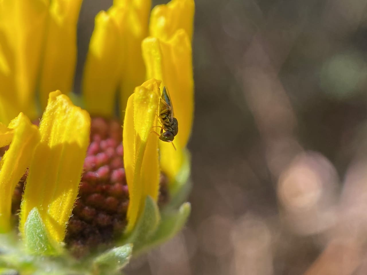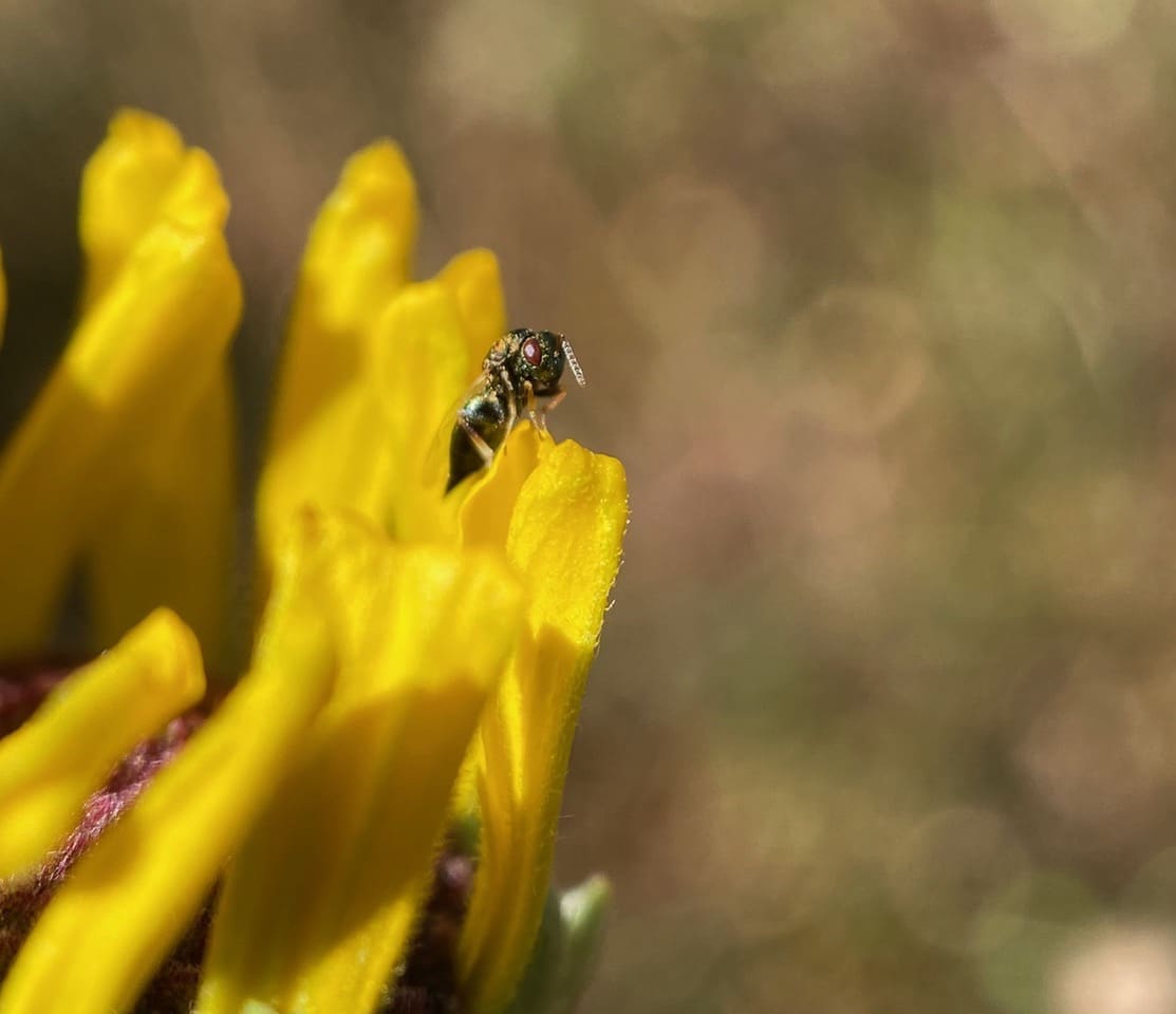 A tiny, iridescent green insect is perched upside-down on a ray petal of Bush Sunflower, Encelia californica.