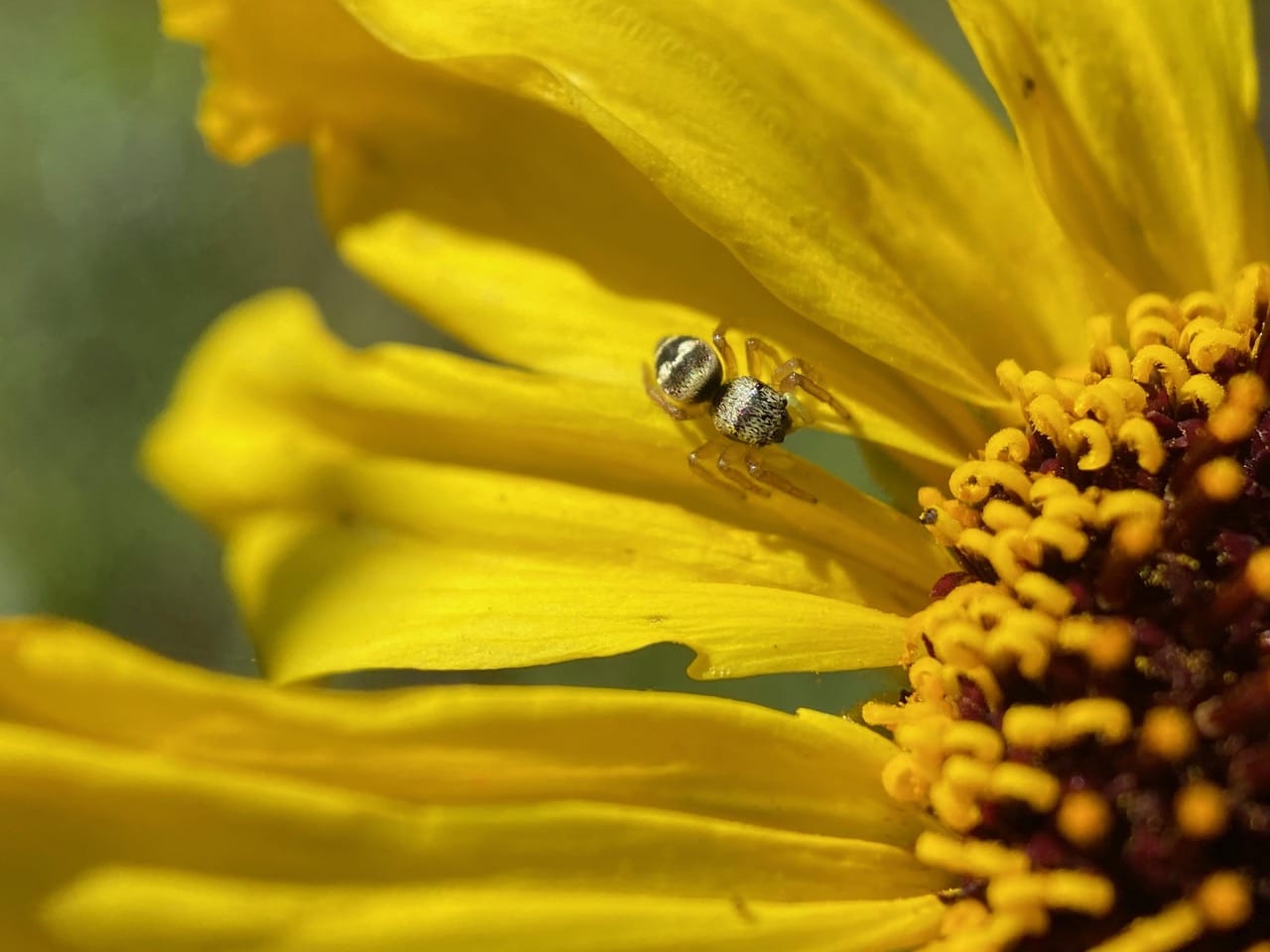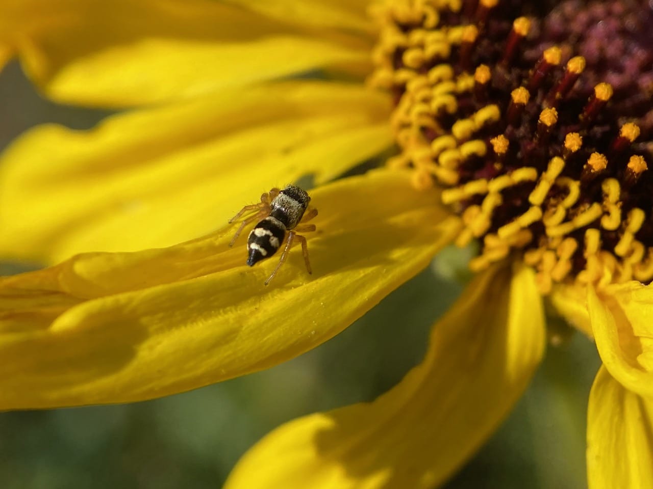 In Stefanie’s backyard, a tiny spider is running on the ray petals of a Bush Sunflower, Encelia californica. I am ready to call it a Zebra Jumper, until I notice that it has pale translucent legs, and yellow pedipalps.