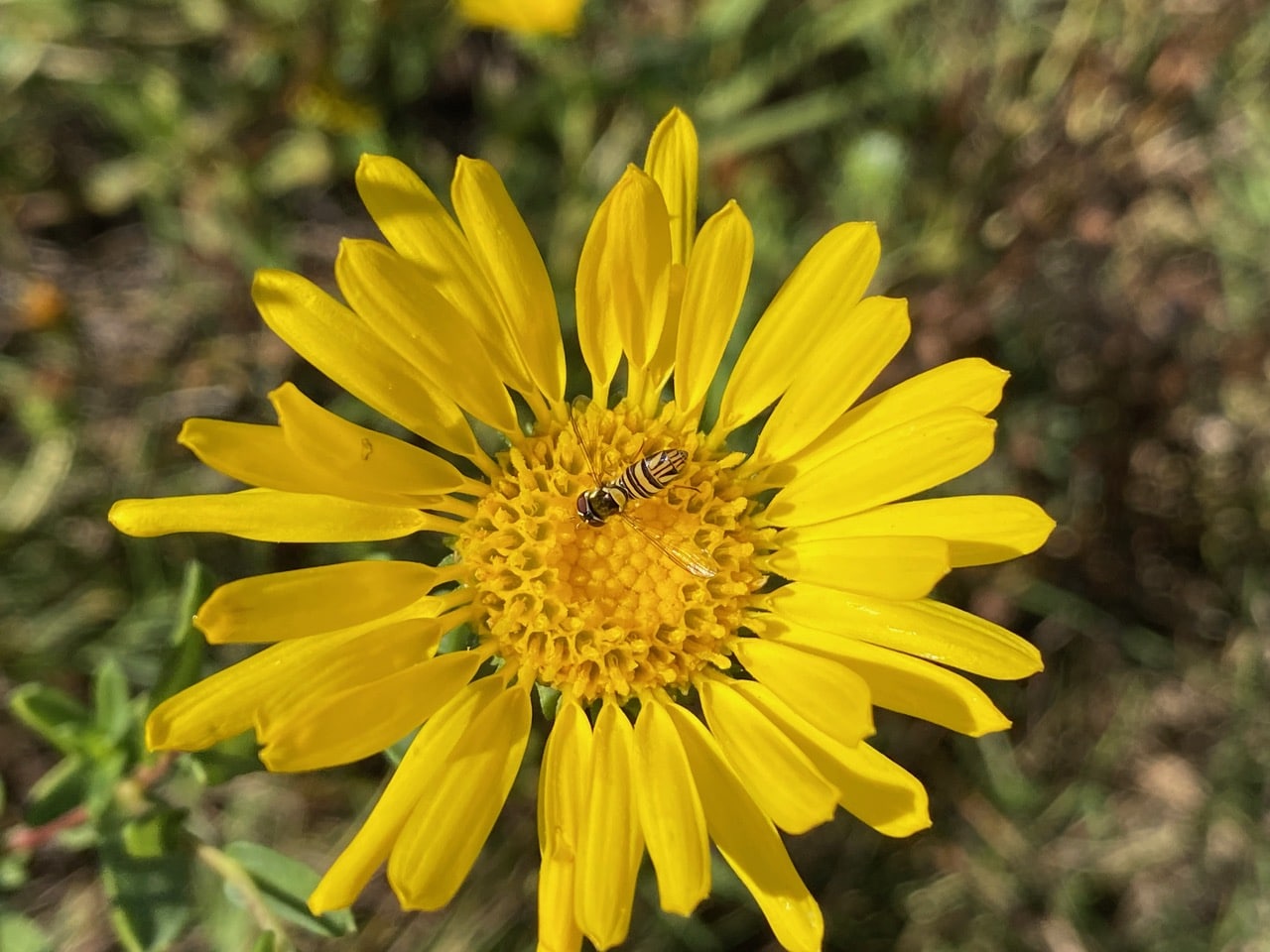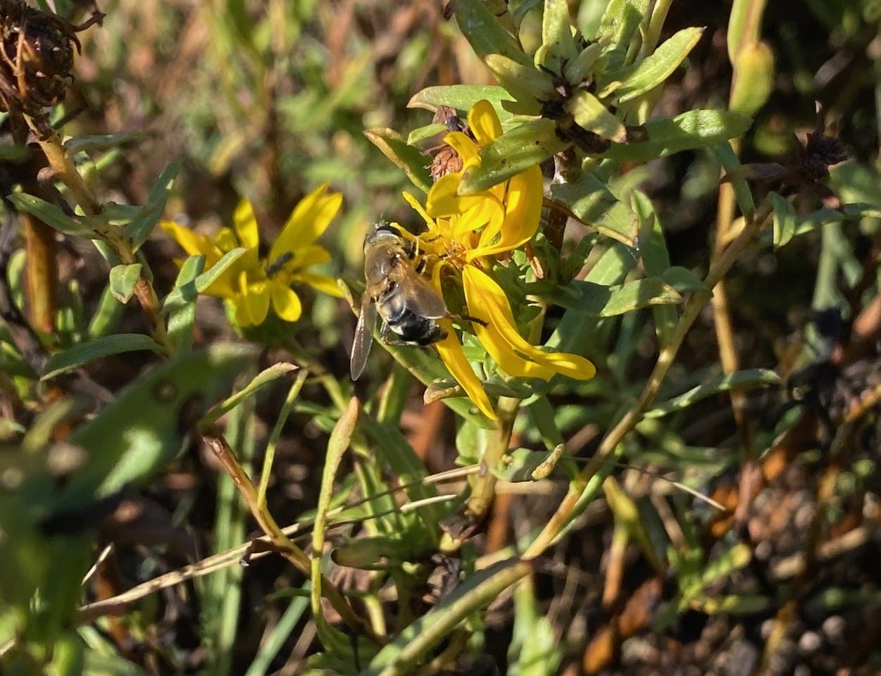 A large fly has landed on a Grindelia flowerhead. It behaves every bit like a hover fly, holding its wings out at an angle from the body.