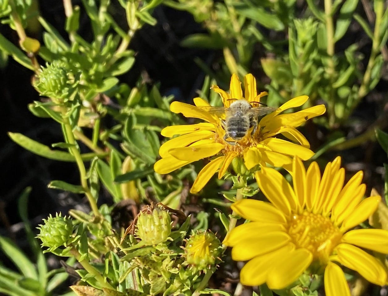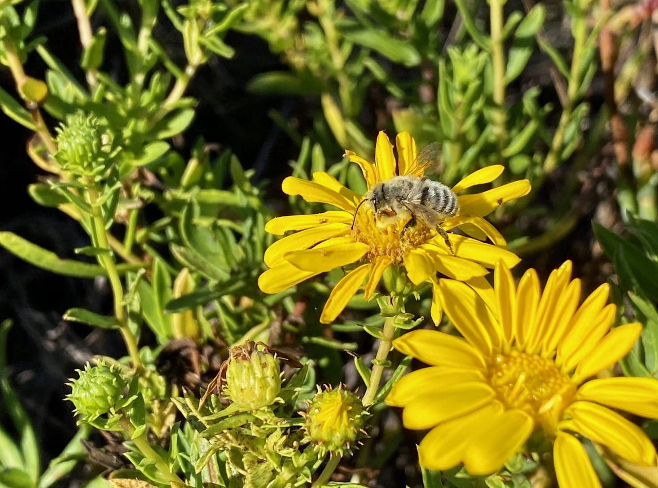 A male Western Leafcutter Bee, Megachile perihirta (family Megachilidae) is foraging on a Grindelia flowerhead.