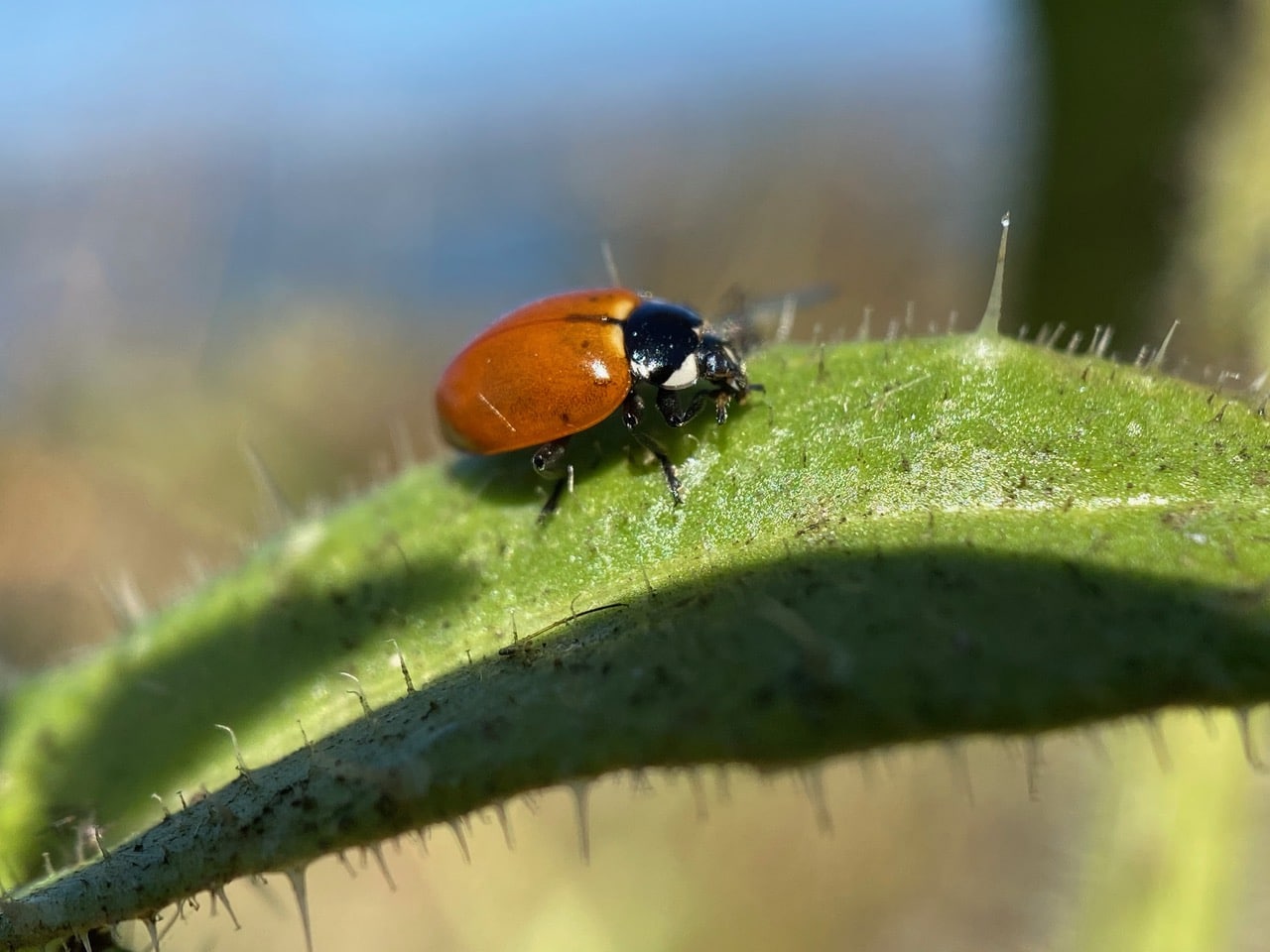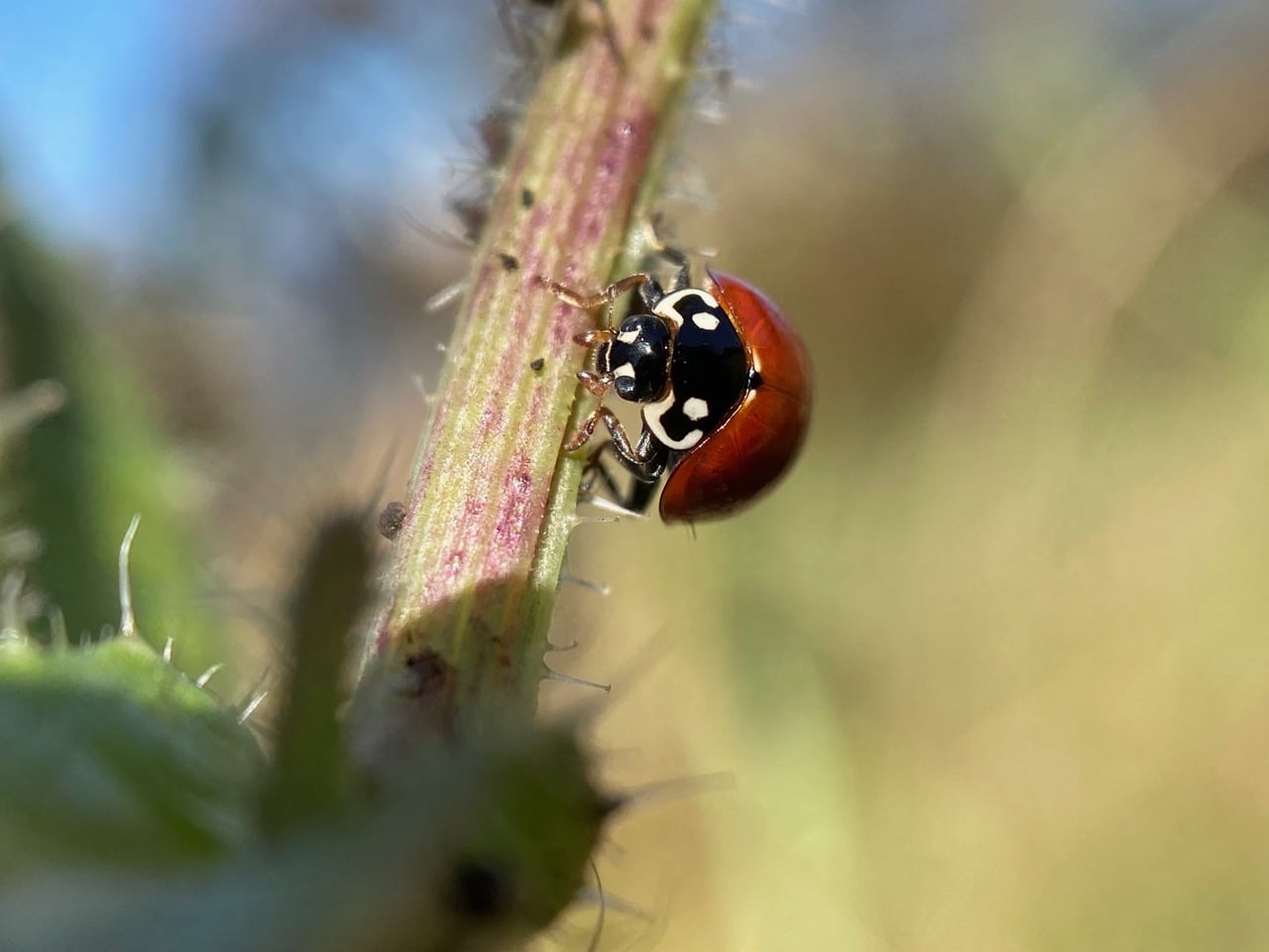 On another branch of the Bristly Oxtongue, a Spotless Lady Beetle, Cycloneda sanguinea (family Coccinellidae) is feeding on an aphid.