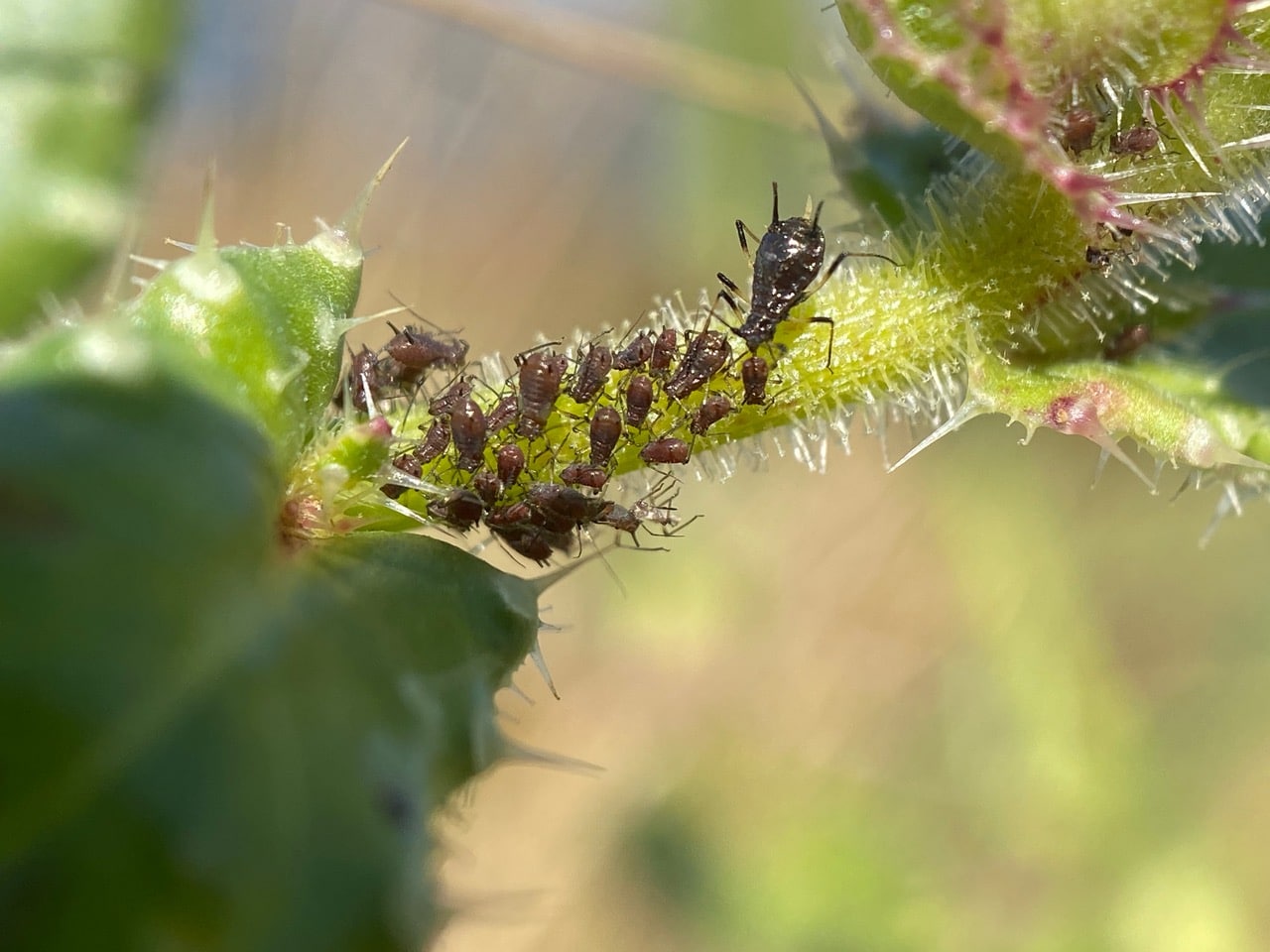 A large aphid is standing next to a group of young aphids of various sizes on a stem of Bristly Oxtongue, Helminthotheca echioides. She might be the mother of them all, with some of them born the same day.