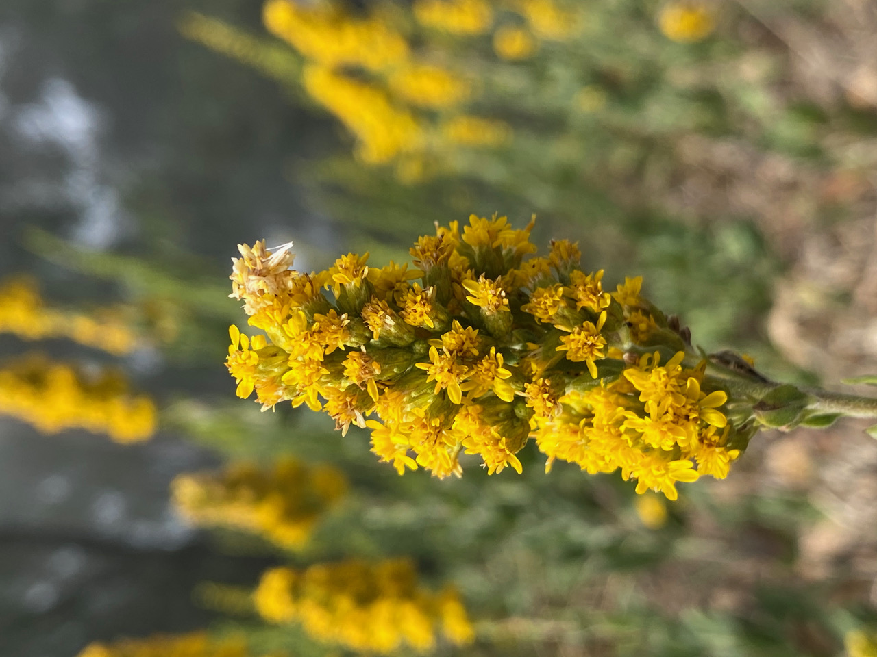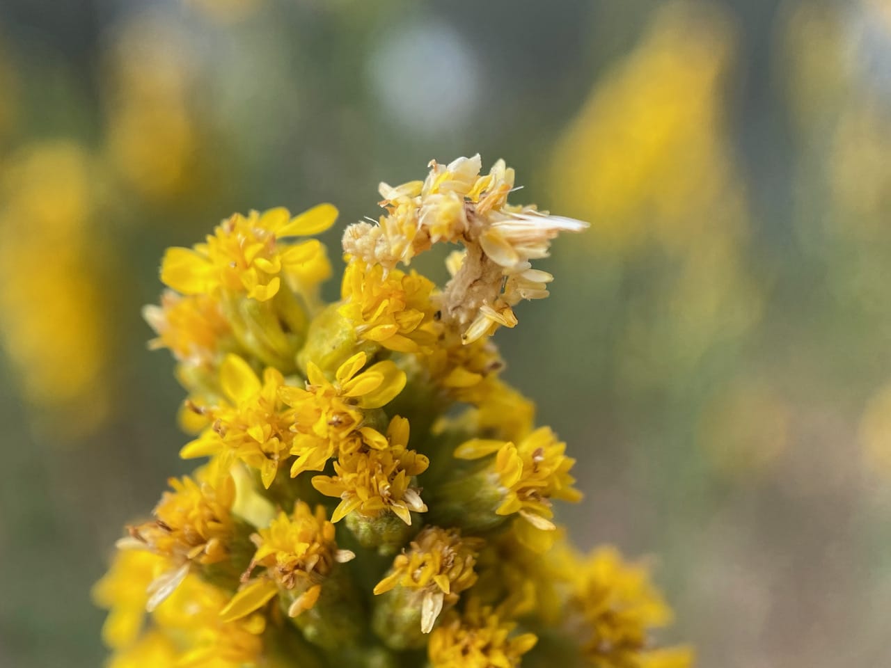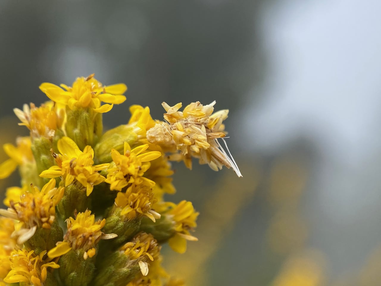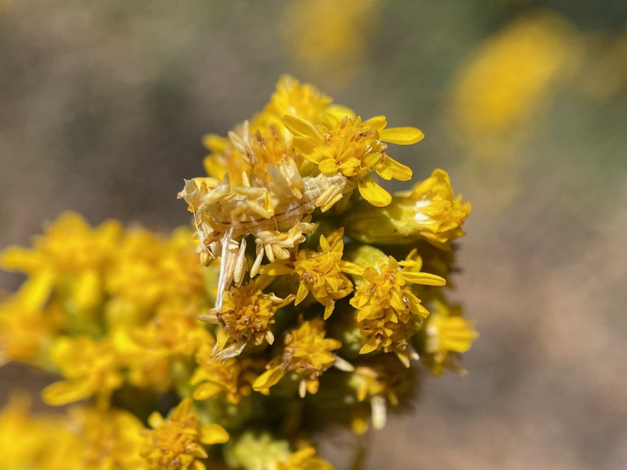 Here’s our little caterpillar, “looping” its way through the flowerheads. I wonder if I have done it a disservice transferring it to a spike of fresh yellow flowers. It’s current camouflage is not working as well in this new environment. A few Yellowjacket wasps are busy patrolling the goldenrod inflorescences, sometimes buzzing past my ears as I take photos. Would they find our little Looper?
