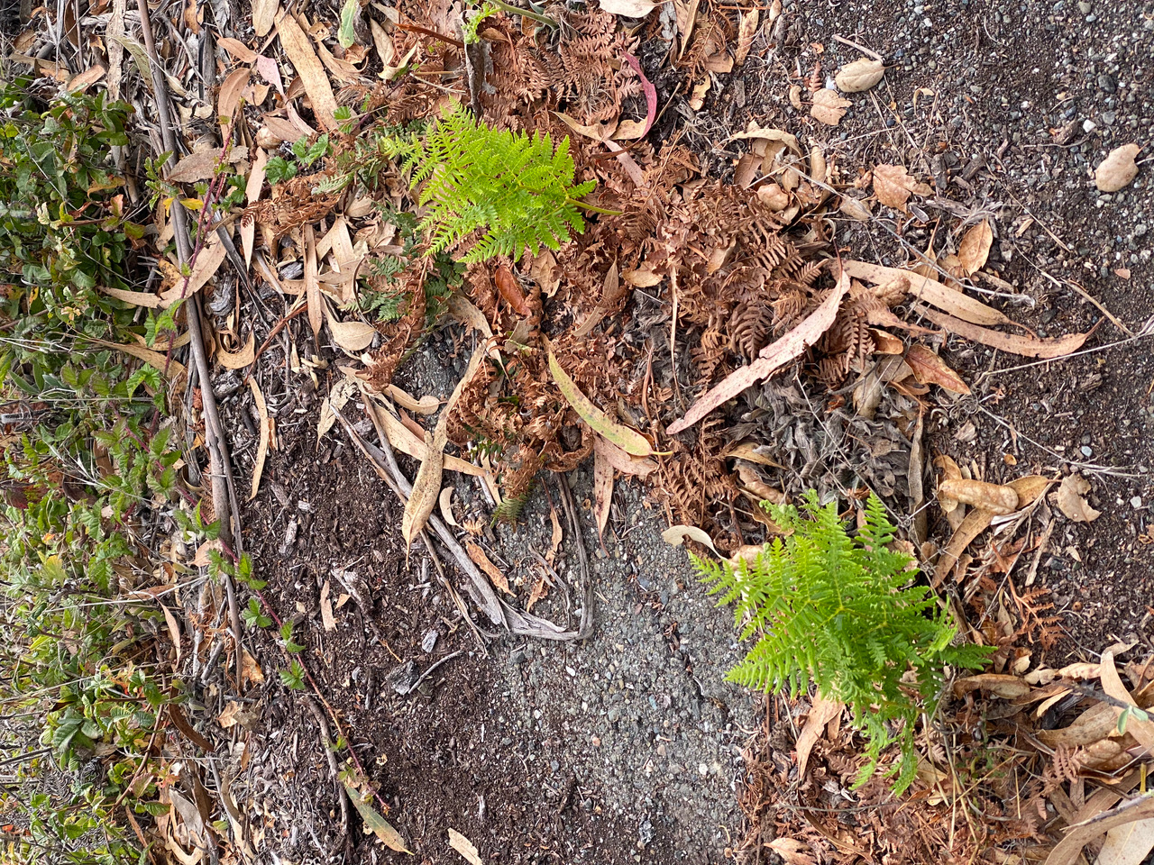 The vegetation on the edges of the paved road has been cleared, exposing the pavement underneath. But look, these resilient Bracken Ferns have managed to emerge through the asphalt! Nature’s renewal is an on-going process, regardless of man’s actions.