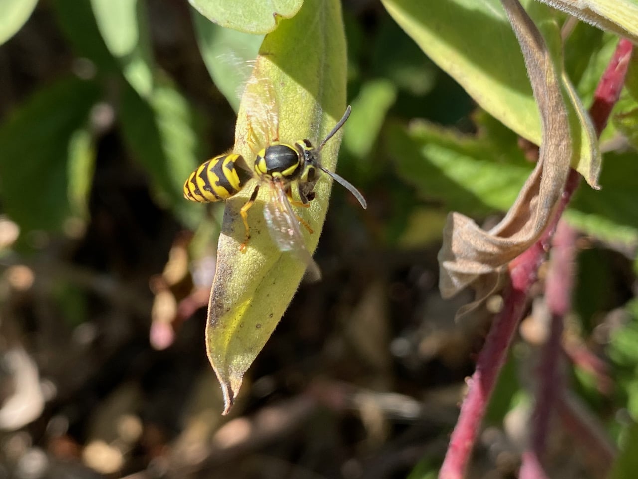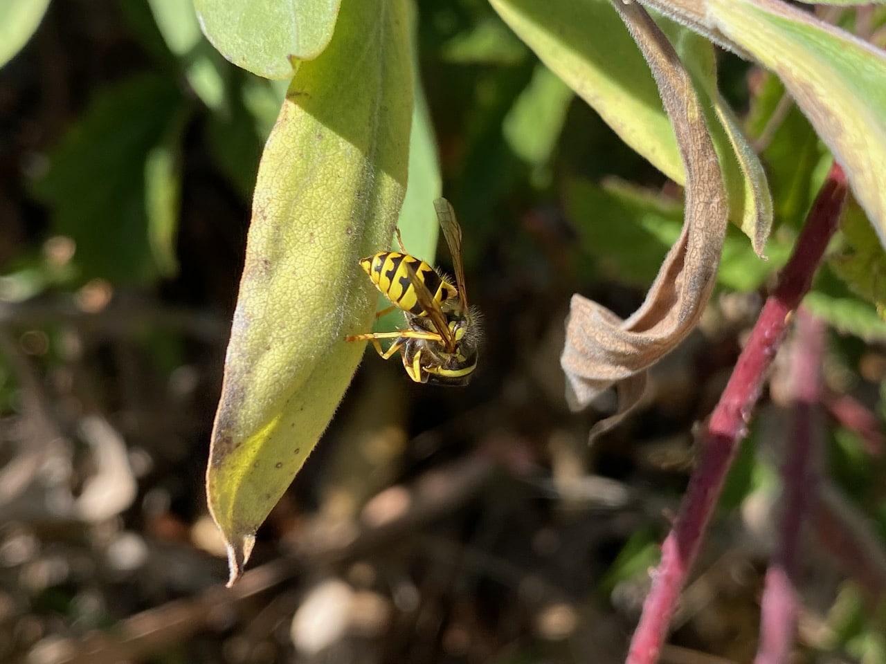 A Yellowjacket flies in unsteadily and lands on a leaf of California Goldenrod. It has a parcel in its front legs that it is now tackling. A struggling prey?