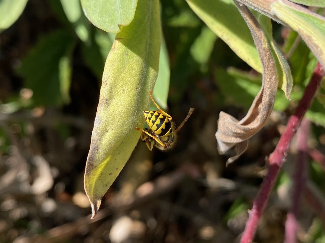 For 30 seconds, I watch as the wasp is hunched over, manipulating the prey in her front legs and jaws. She is probably killing it, whatever it is, before ferrying it to her nest.