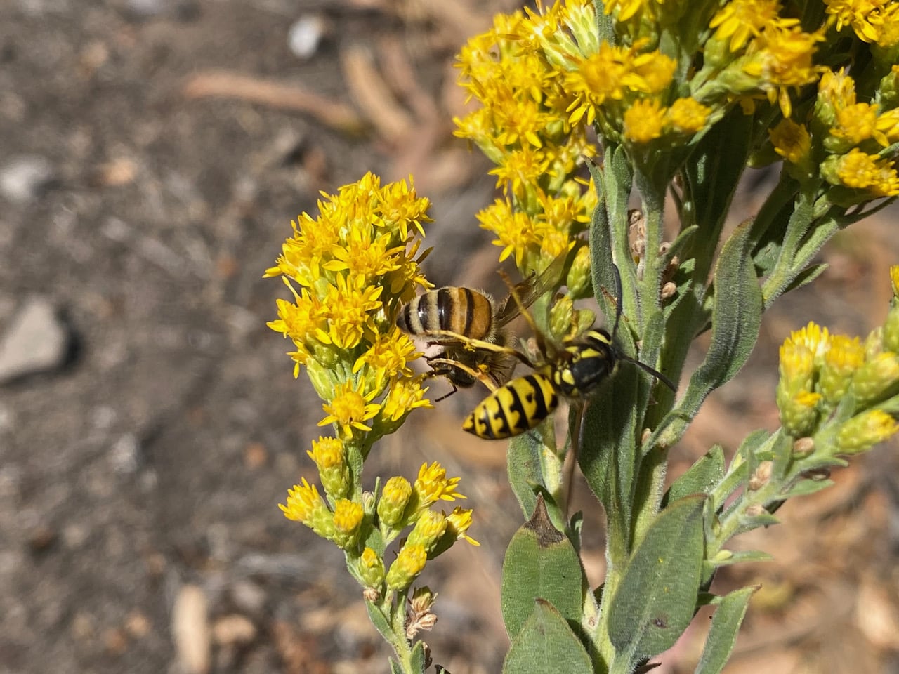 Out of nowhere, a Yellowjacket wasp whizzes in to bump the bee off its perch. Why does the wasp do this? The bee is not a prey item for the wasp. I have often seen this behavior, regularly on Yampah when it was in bloom, and now on the goldenrods.