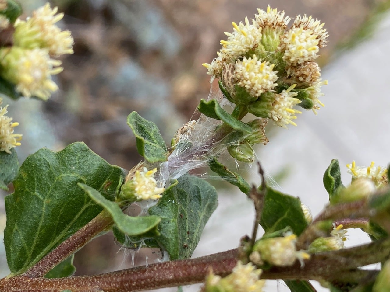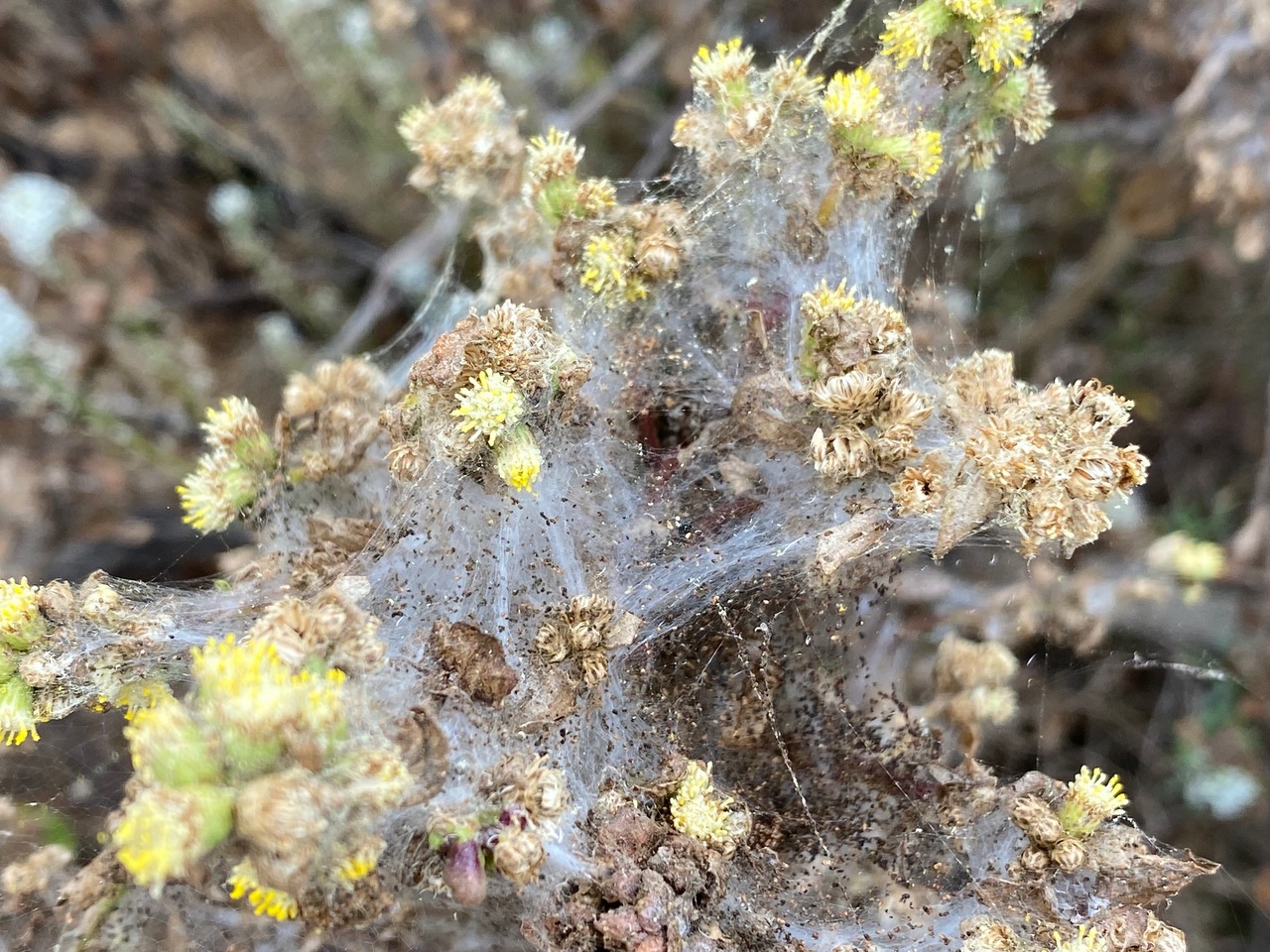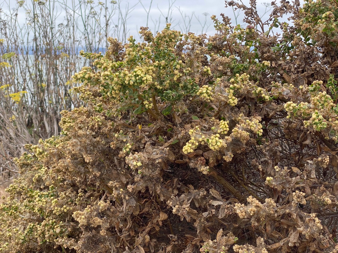 The male Coyote Brush, Baccharis pilularis that Naomi has planted in the sidewalk strip is in bloom. Many of the branch tips have silk covering them.