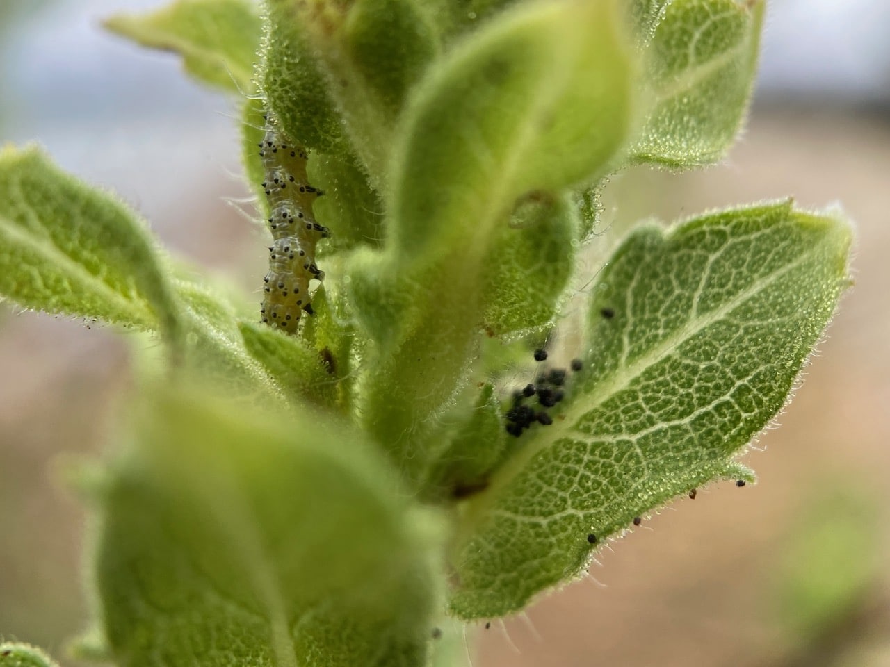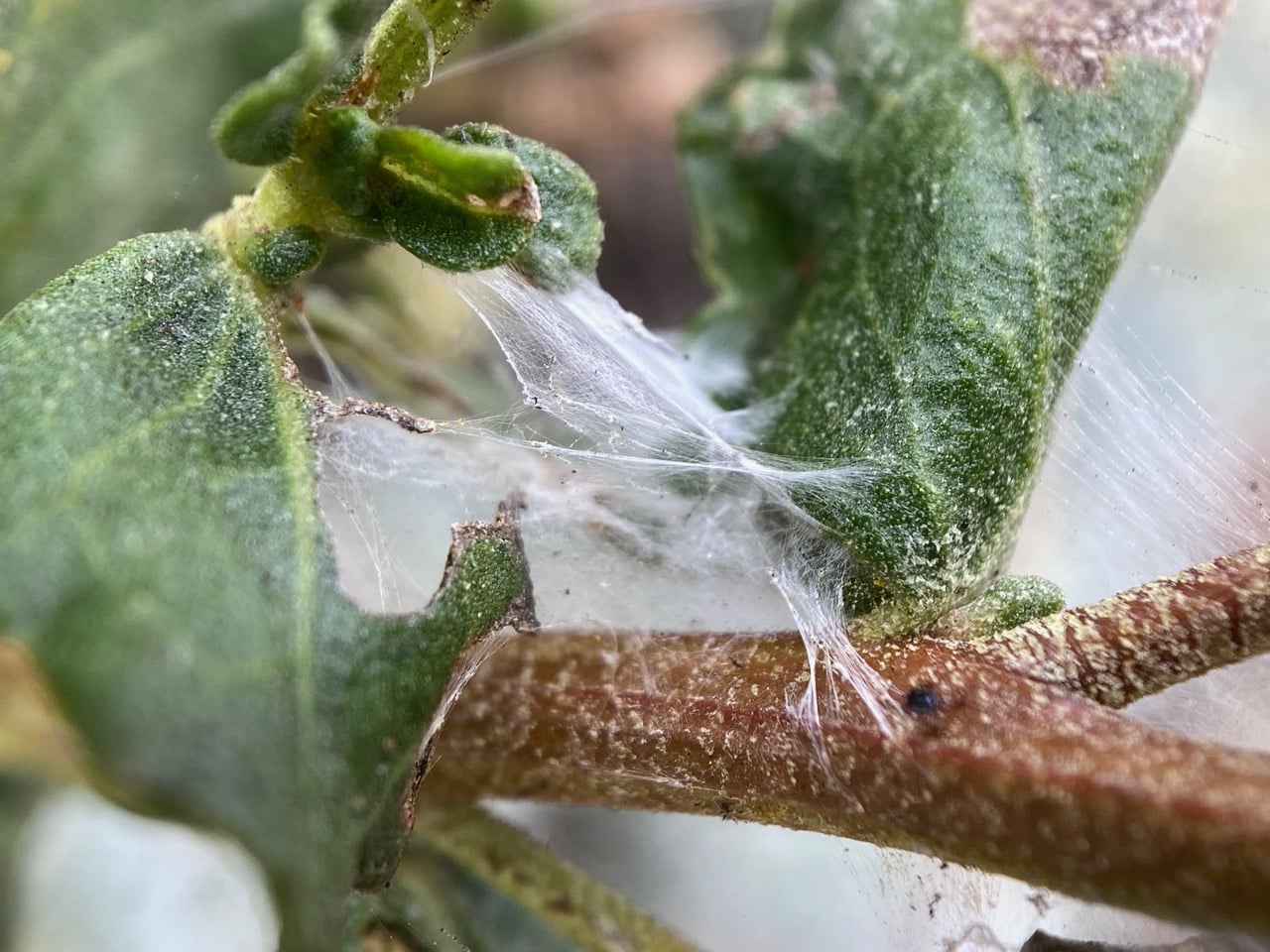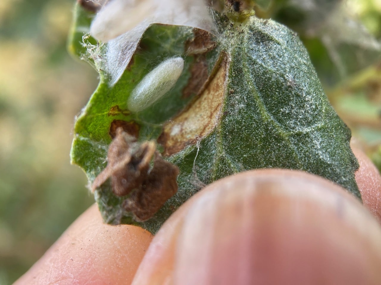 I think there’s a greenish caterpillar under that silken shelter on the lower left. Again, I didn’t see it when I took the picture.