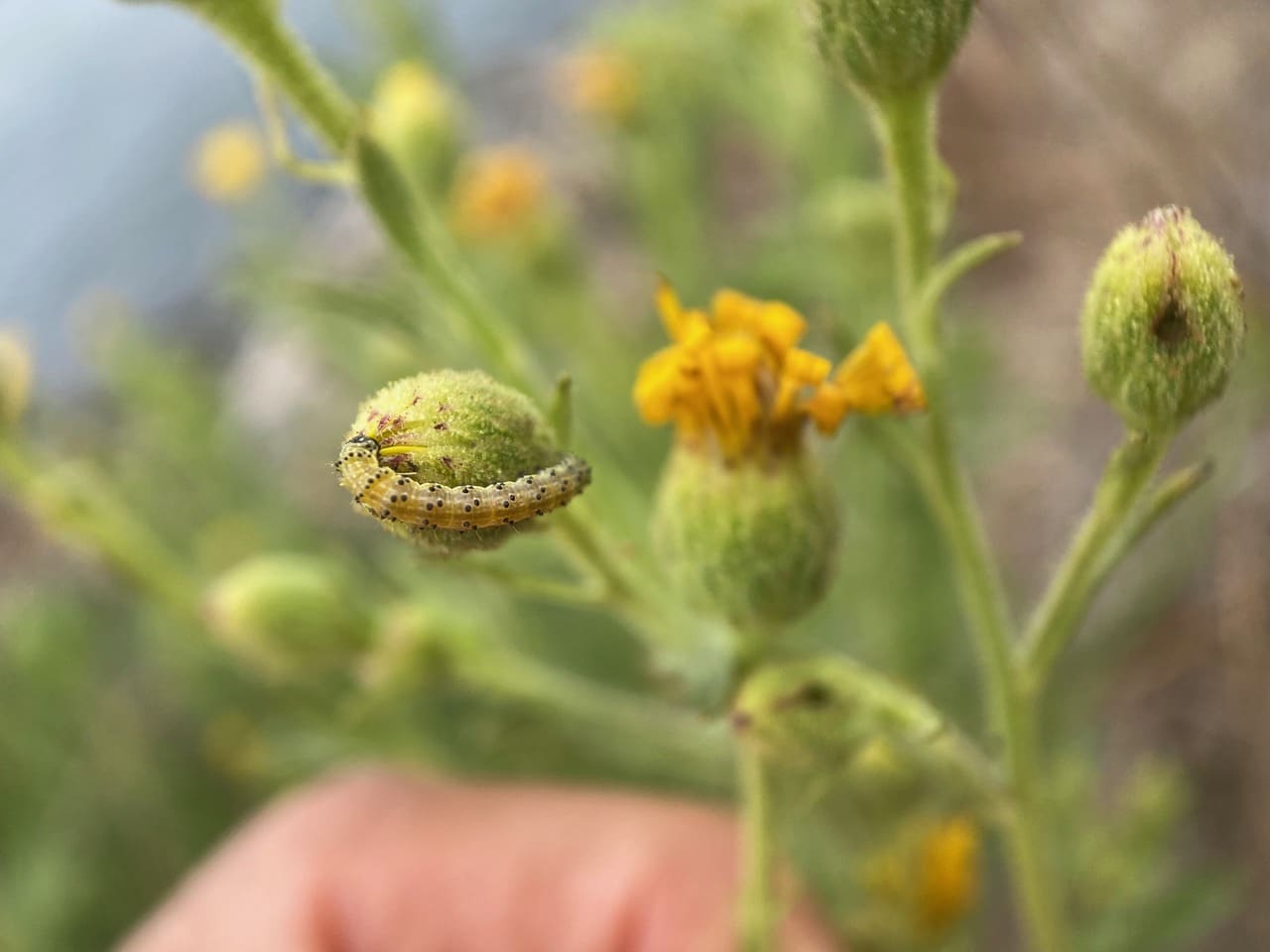 A small greenish caterpillar with raised black spots is feeding on an immature flowerhead of Telegraphweed. iNaturalist has helped identify it as a Darker-spotted Straw Moth, Heliothis phloxiphaga (family Noctuidae).