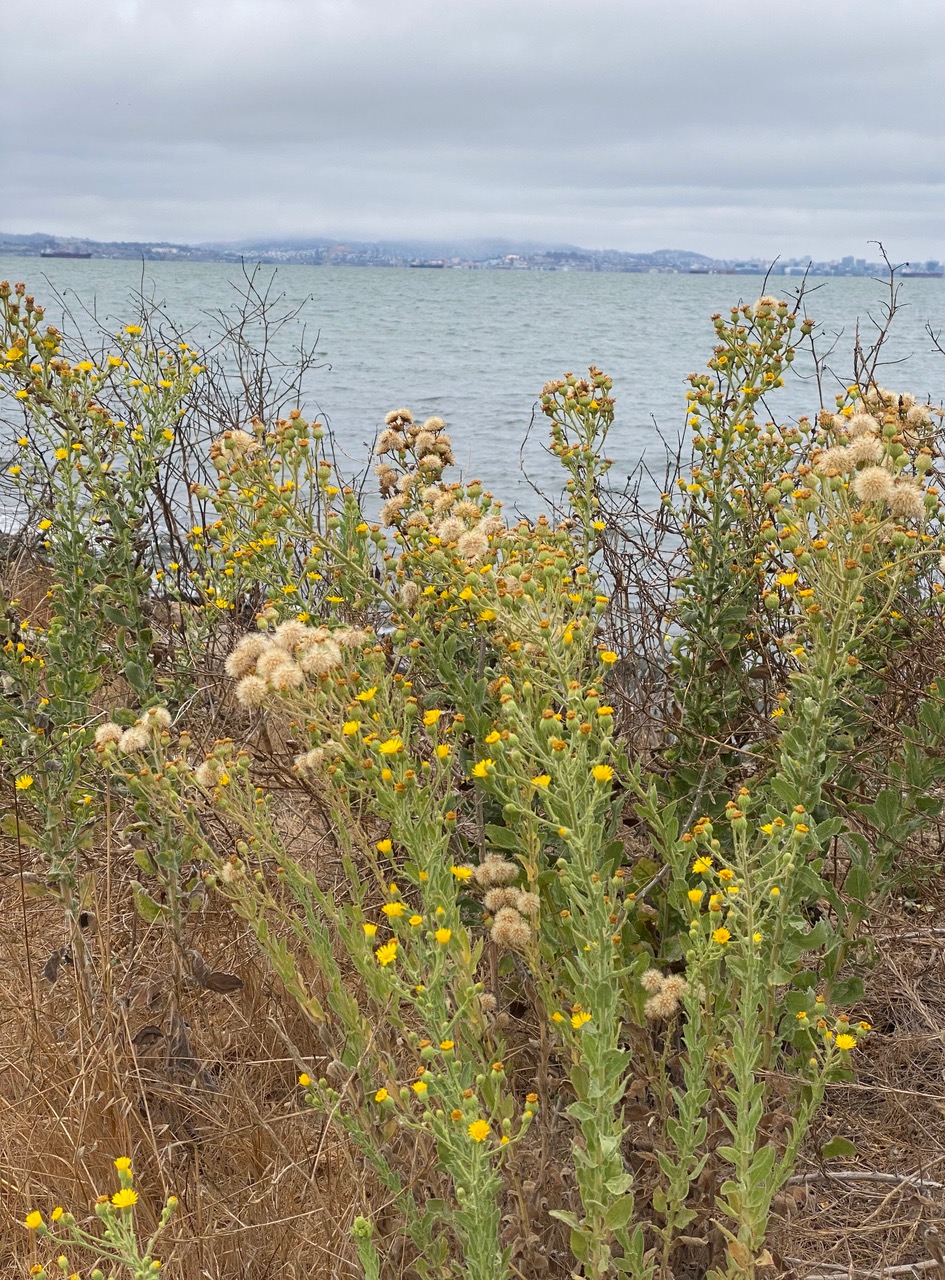I drive the short distance to Bay Farm to walk the familiar Shoreline Trail by the water. At 10:30 am, the sky is still heavily overcast. The tall and gangly Telegraphweed, Heterotheca grandiflora are in bloom; some already gone to seed.