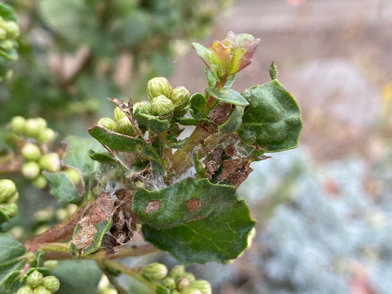 Whatever caterpillars (or spiders) on the shrub have made extensive use of fine silk to bind the leaves and stems together.