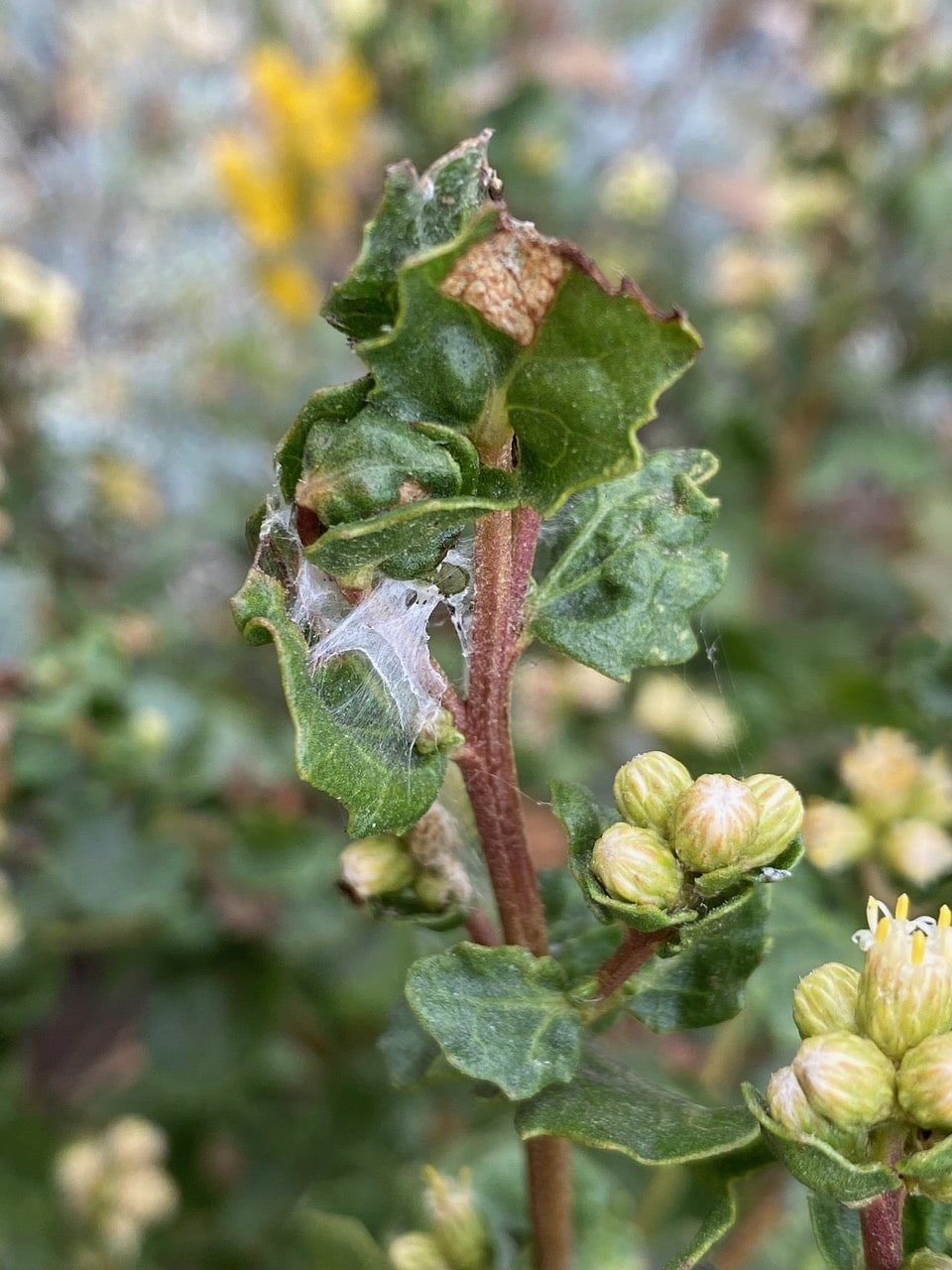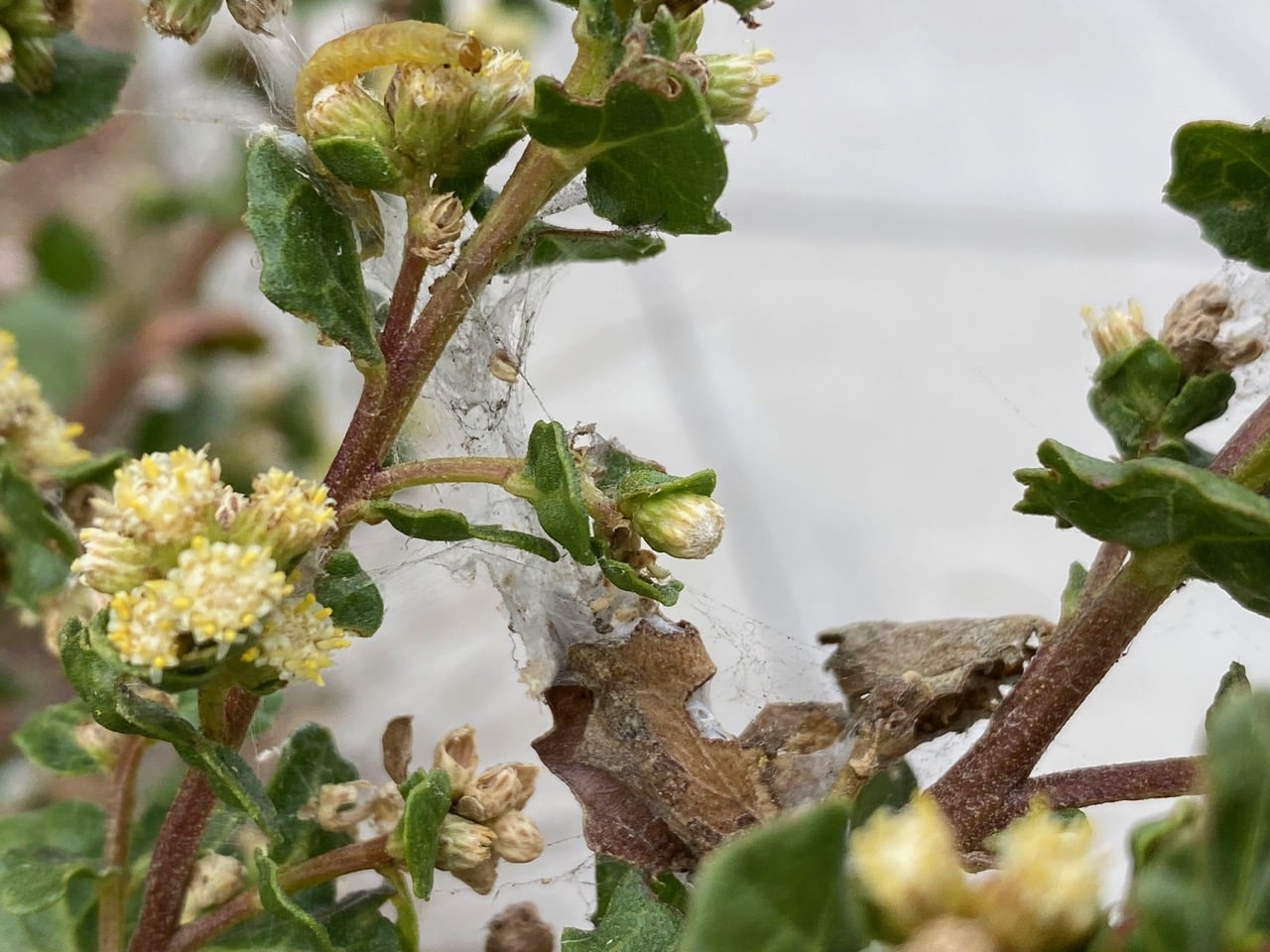 There are signs of caterpillar feeding on some of the Telegraphweed – tiny speckles of frass caught on silken webs among the foliage. Do you see the caterpillar?