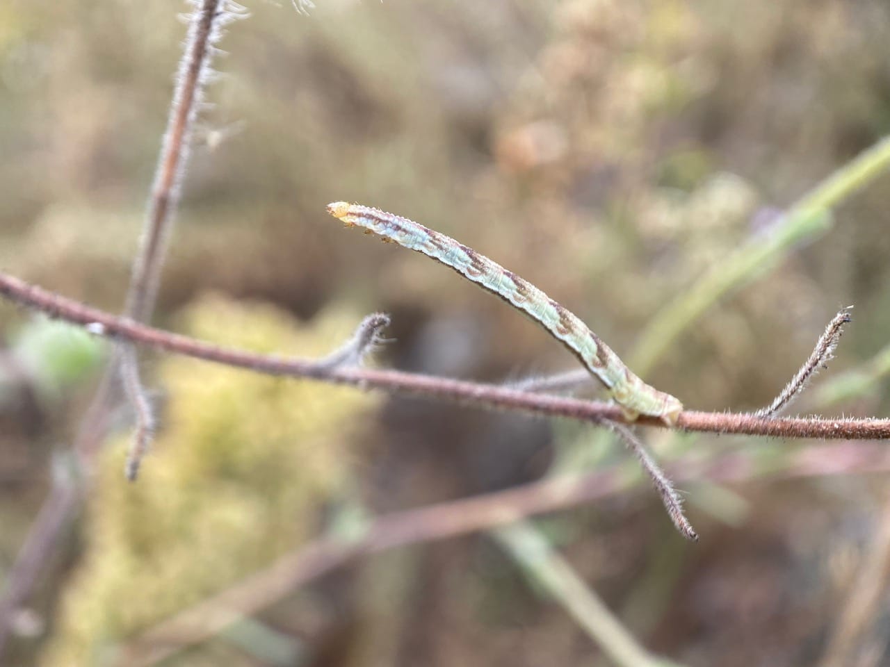 Just inches lower down on an adjacent stem, an inchworm caterpillar is trying to look innocuous, blending in with the sparse gray-green foliage. It is a larva of the Common Eupithecia Moth, Eupithecia miserulata (family Geometridae).