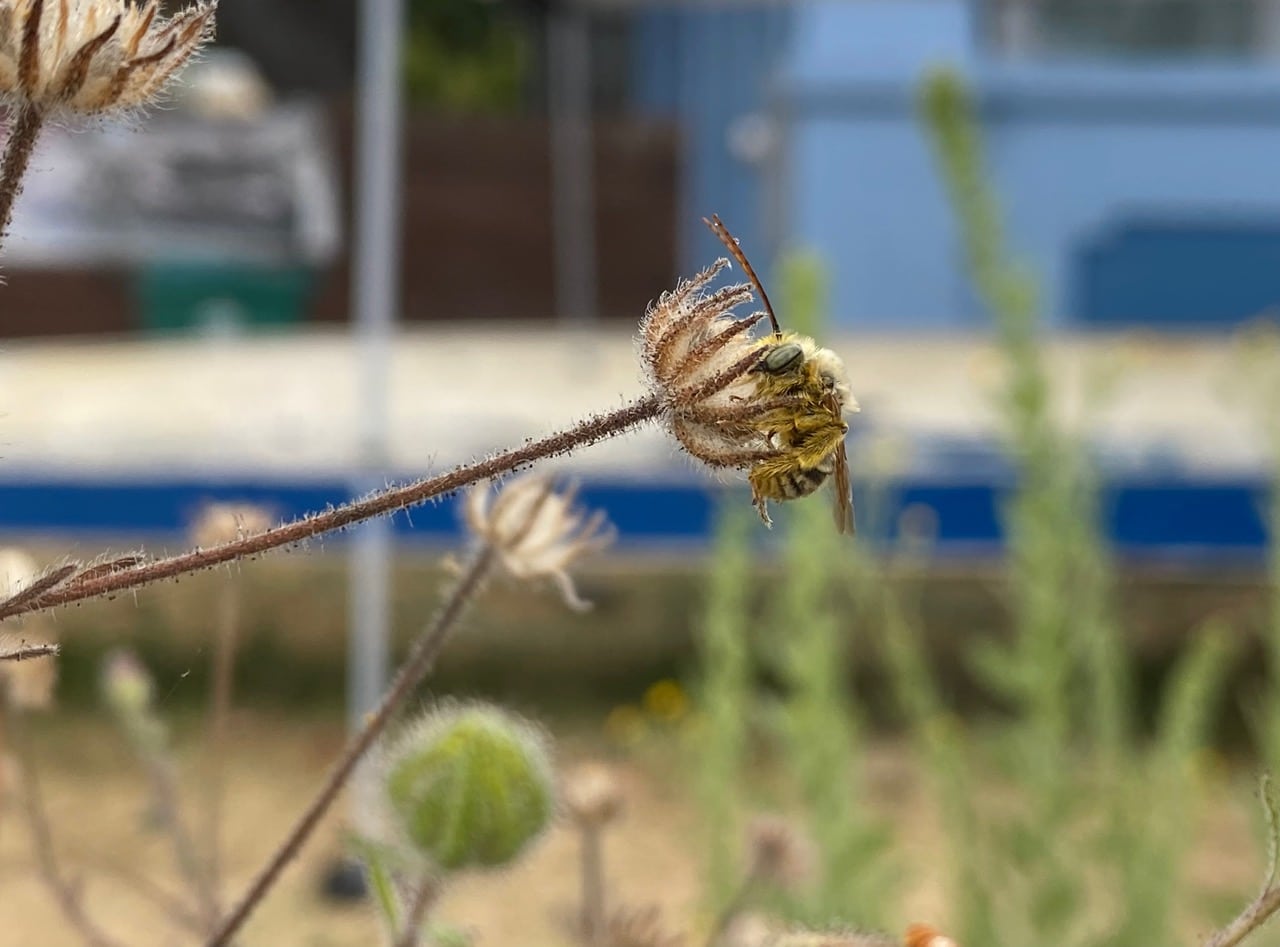 This is the first cool, cloudy day after a spell of heat, and the air is clean. I am elated to be able to go outdoors again. On the way to Bay Farm, I decide to stop by Naomi’s sidewalk garden. Maybe the male Longhorn Bees are still sleeping?