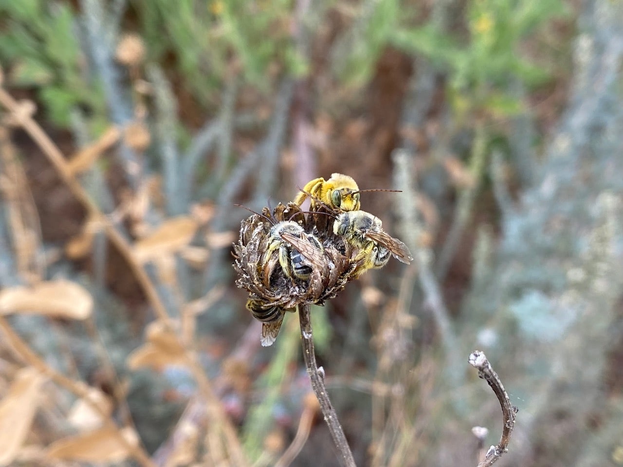 Sure enough, four male Longhorn Bees, Melissodes sp. (family Apidae) are still sleeping together on a spent Grindelia seed head. Yes, their eyes are wide open – insects do not have eyelids.