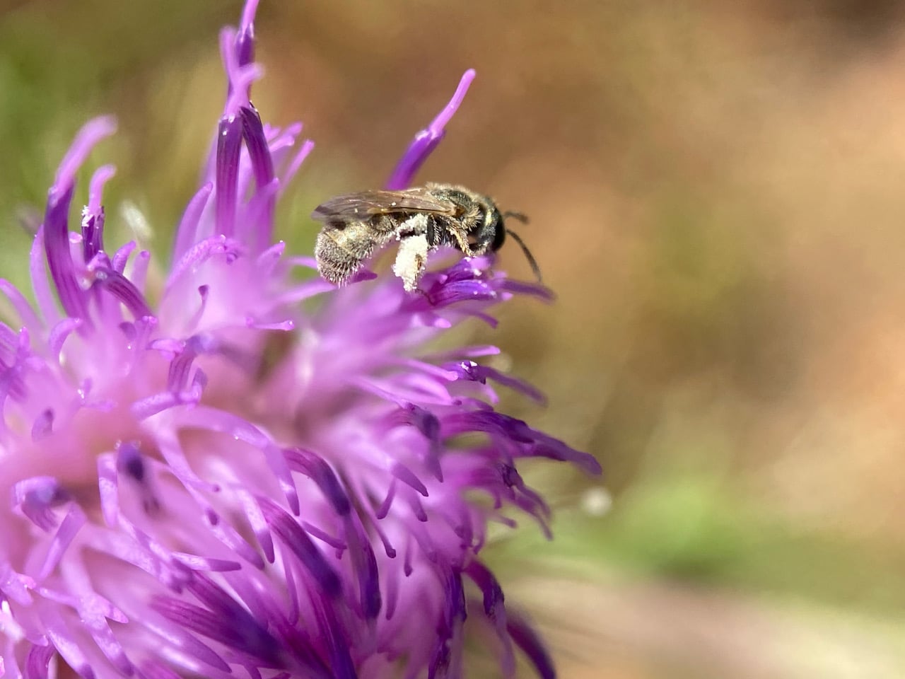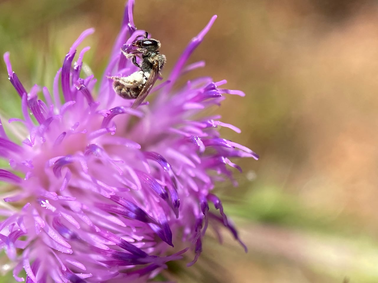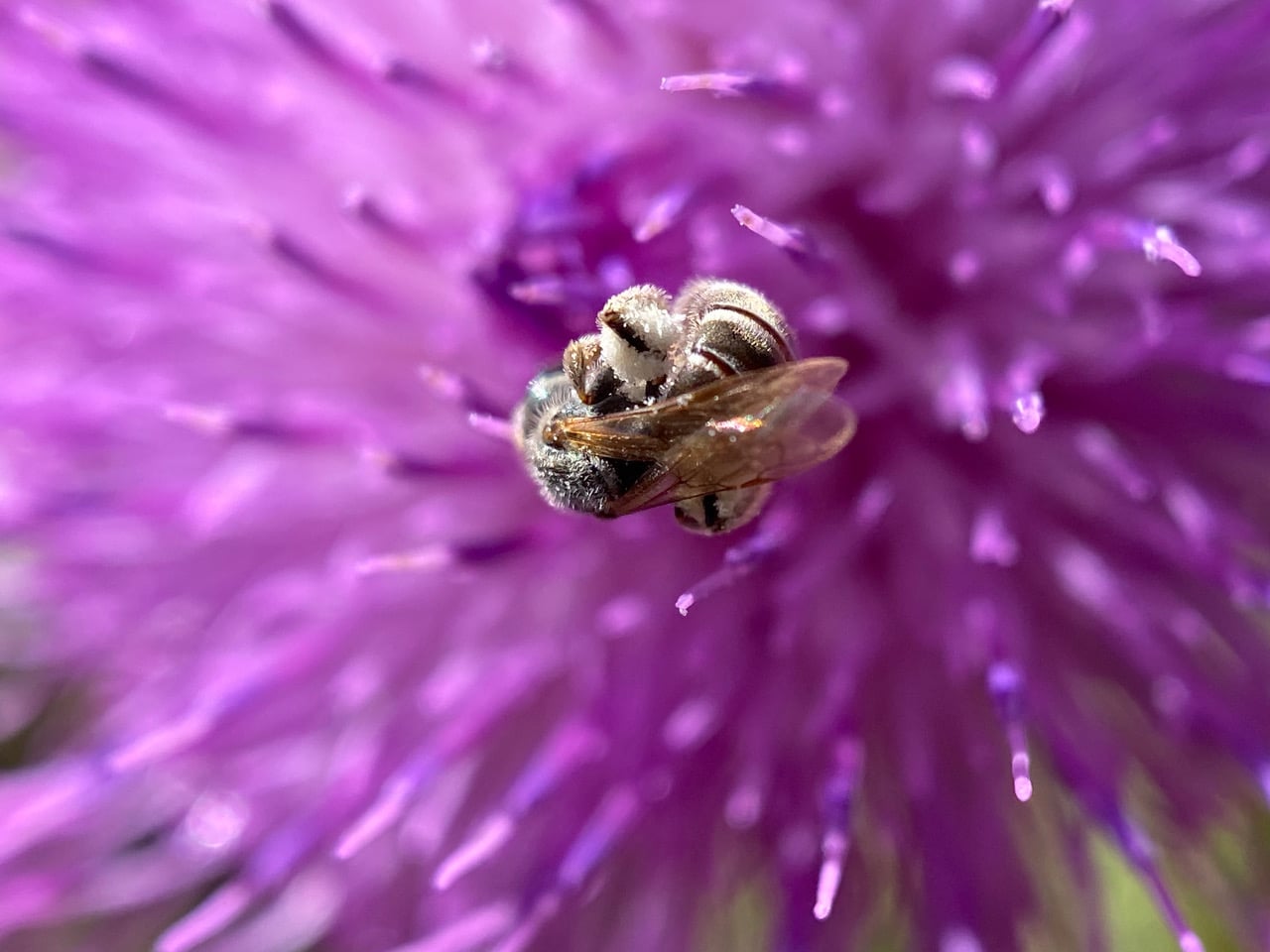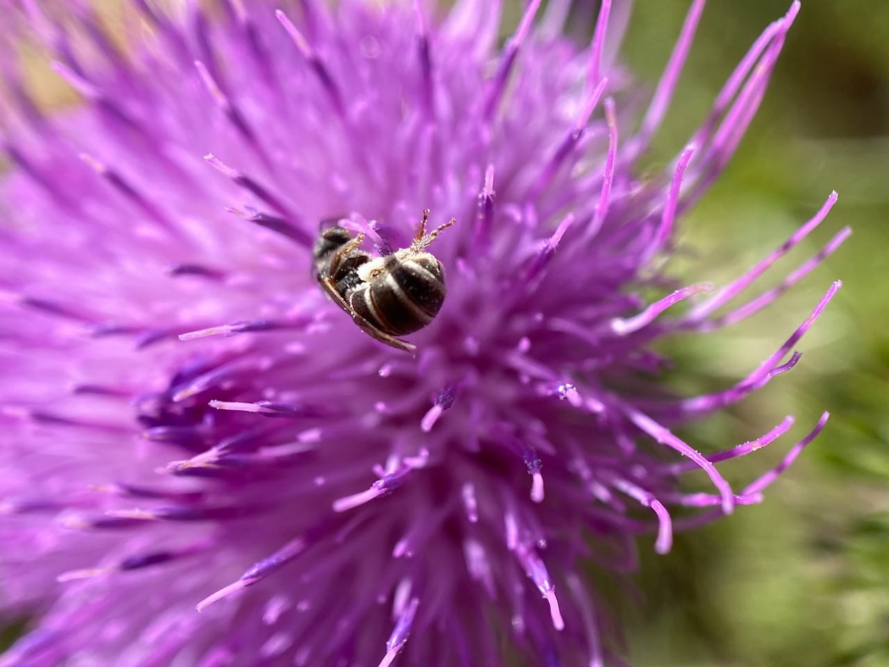 The Bumble Bees and Honey Bees are still dominating the scene, but I spend more time observing the little bees on the thistle flowerheads. This one is in a typical pollen gathering mode. She is embracing the tip of the anther tubes and scraping the pollen onto the scopae on her belly as well as her hind legs.