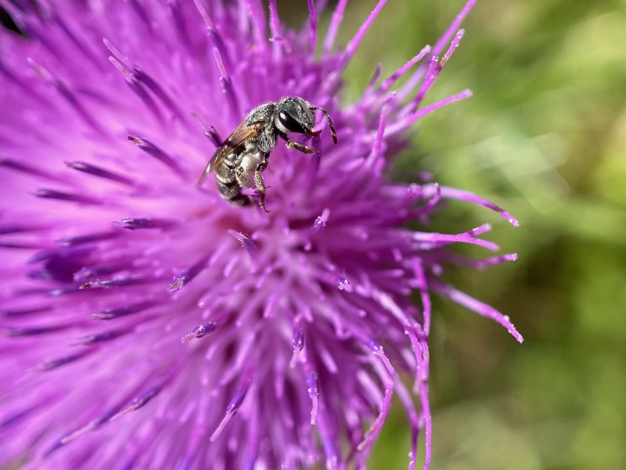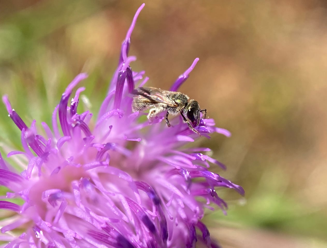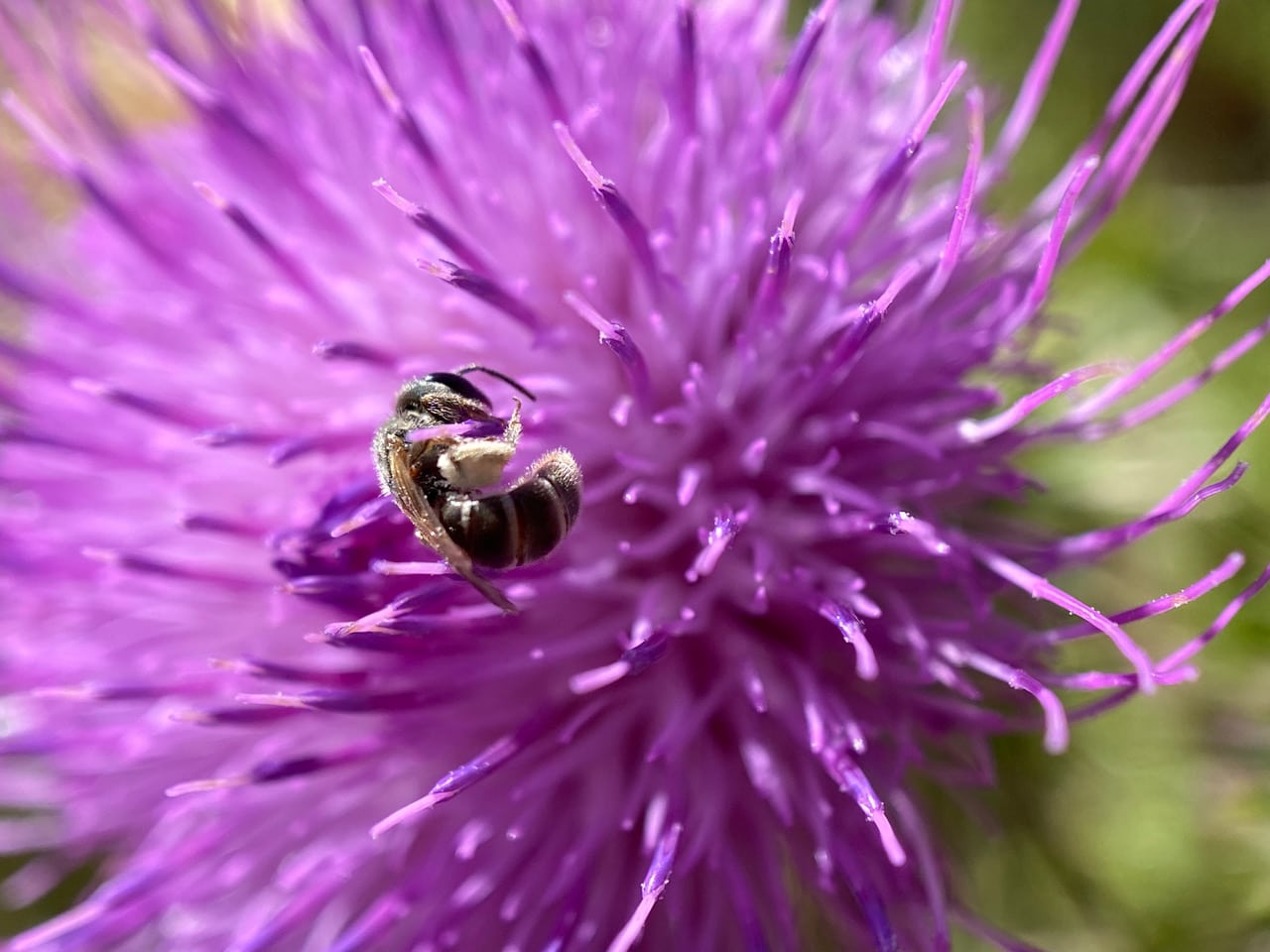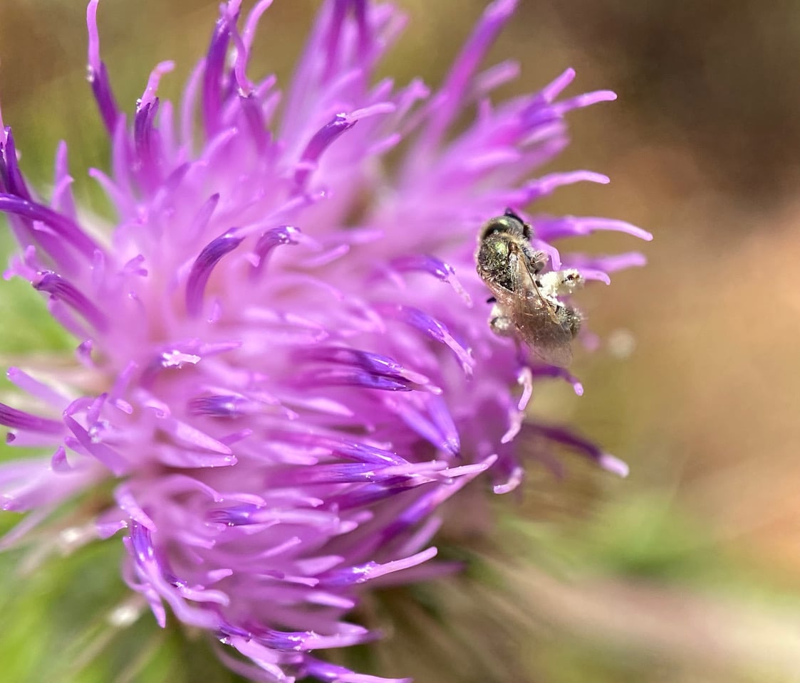 A Metallic Sweat Bee, Lasioglossum (Dialictus) sp. (family Halictidae) is collecting pollen from the Bull Thistle flowers.
