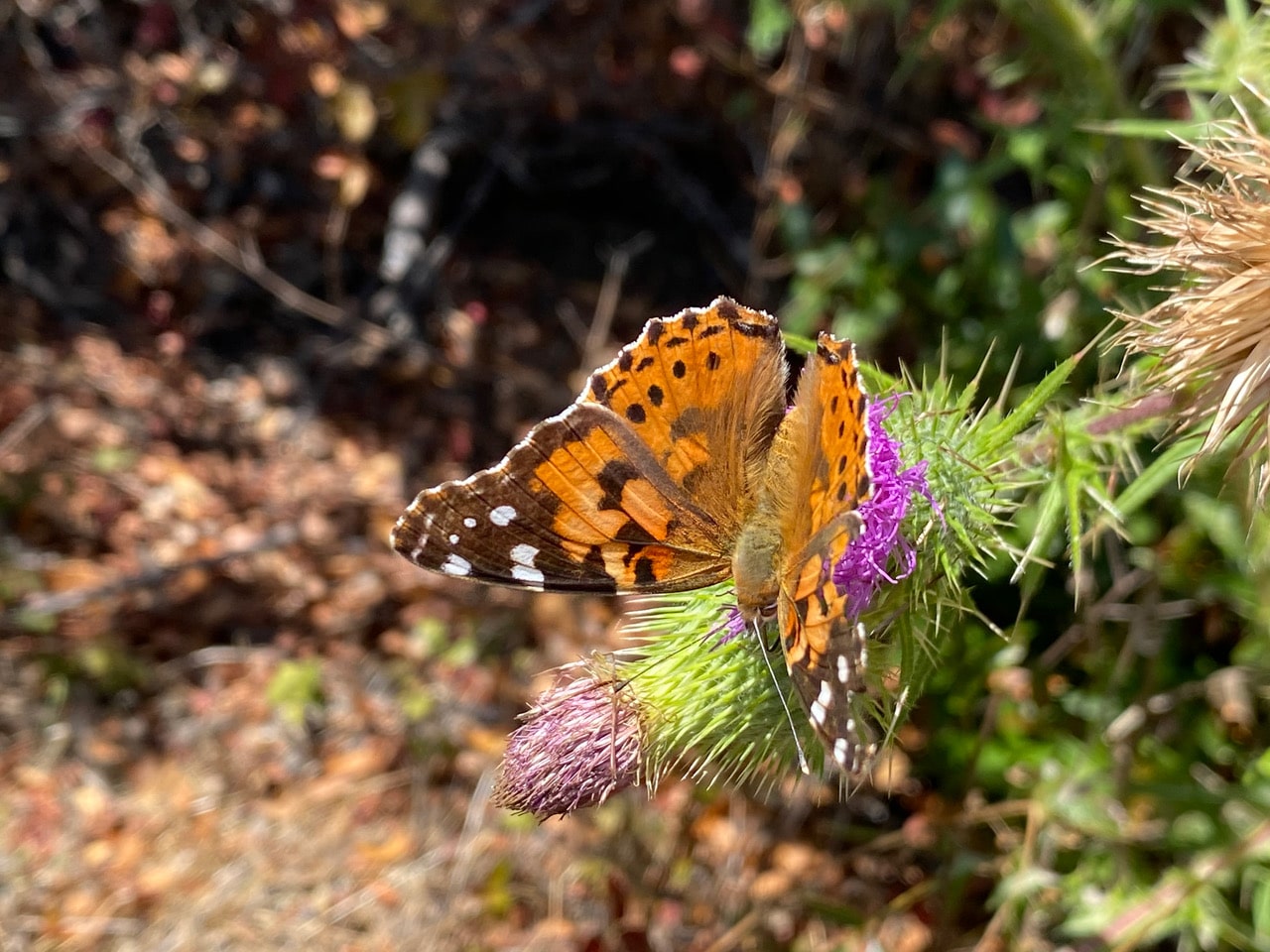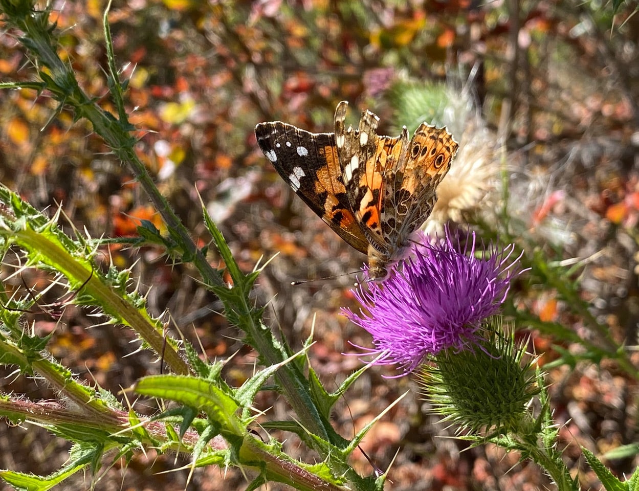 This side view of the butterfly’s underwings should be useful for ID purposes. Note that the butterfly is probing for nectar with its long and flexible proboscis. The thistle’s tight clusters of small flowers are especially attractive to butterflies. In a single stop, a butterfly can access nectar from numerous flowers with minimal expenditure of energy.
